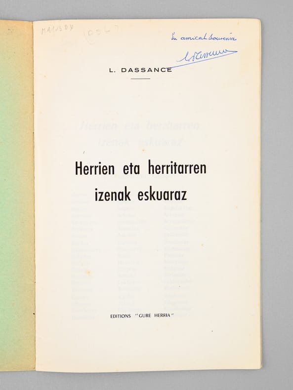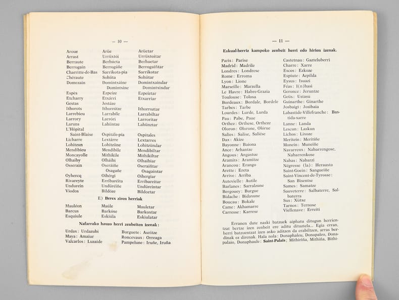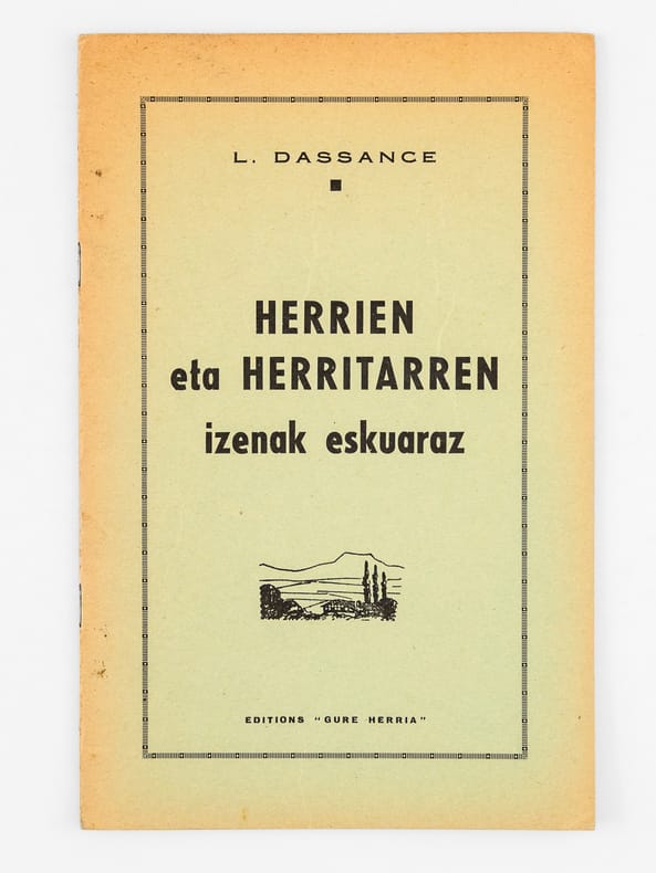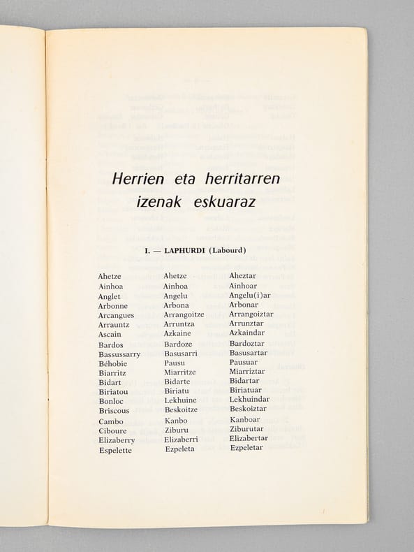Cette brochure propose une étude toponymique sur les communes du pays basque, et fournit pour chaque commune le nom français, le nom basque et le gentilé basque (pour Saint-Jean-de Luz, Donibane-Lohizun et Donibandar). Bon état.