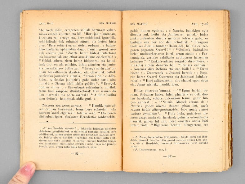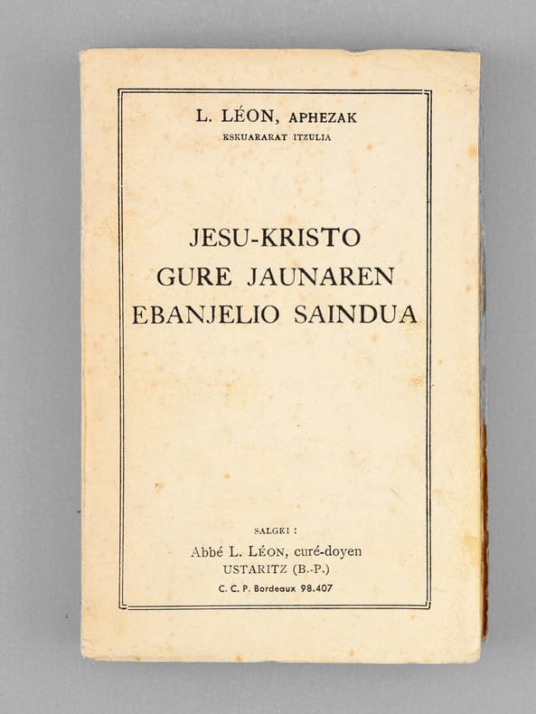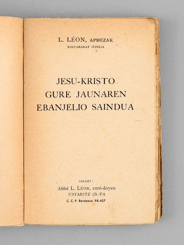 Cette traduction basque complète des Saints Evangiles est reconnue comme agréable à lire. On peut lire page 293 cette curieuse note, ancrée dans le terroir et bien parlante pour les rivalités locales : "Samariarra Juduarentzat, gu Eskualdunentzat Kaskoina baino miletan gutiago zen oraino" (traduction : « Les Samaritains étaient pour les Juifs mille fois moins que ce qu'étaient les Gascons pour nous les Basques). Sur ce sujet, on consultera avec profit la remarquable étude de Jesus M. Zabaleta : "La traduction de la Bible au Pays Basque. Aperçu historique". Etat très satisfaisant (couv. lég. frottée)