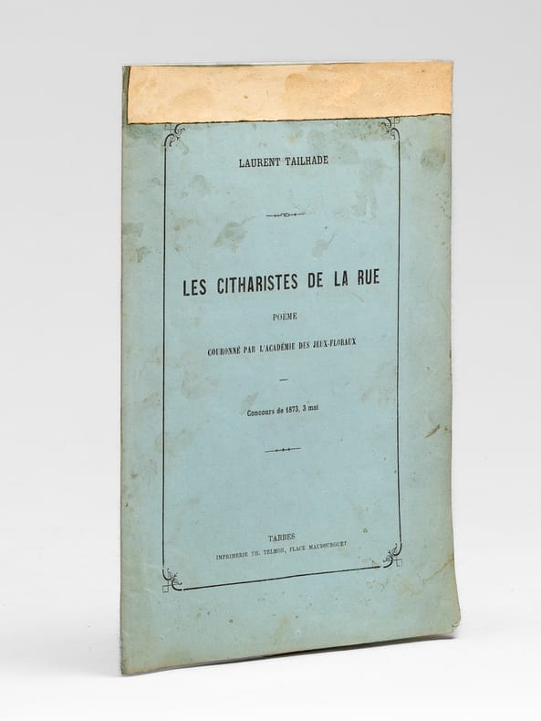 Très rare exemplaire de l'édition originale d'une des toutes premières publications, et probablement la toute première, du tout jeune écrivain et poète, futur féroce polémiste, né à Tarbes, Laurent Tailhade (1854-1919). Etat très satisfaisant (restauration en couv., bon exemplaire par ailleurs) pour cette véritable rareté, récompensée d'une violette aux Jeux Floraux de 1873, et citant Baudelaire en épigraphe : "Notre âme est un trois-mâts, cherchant son Icarie".