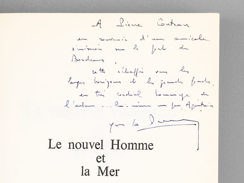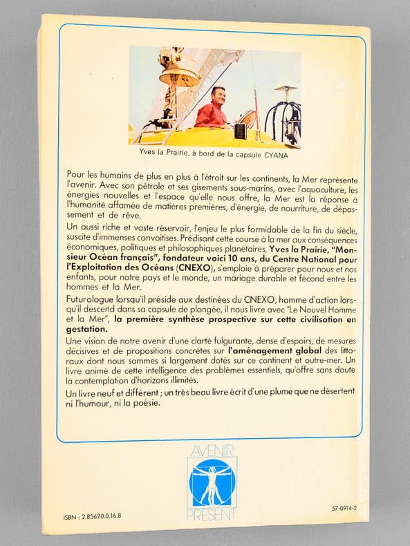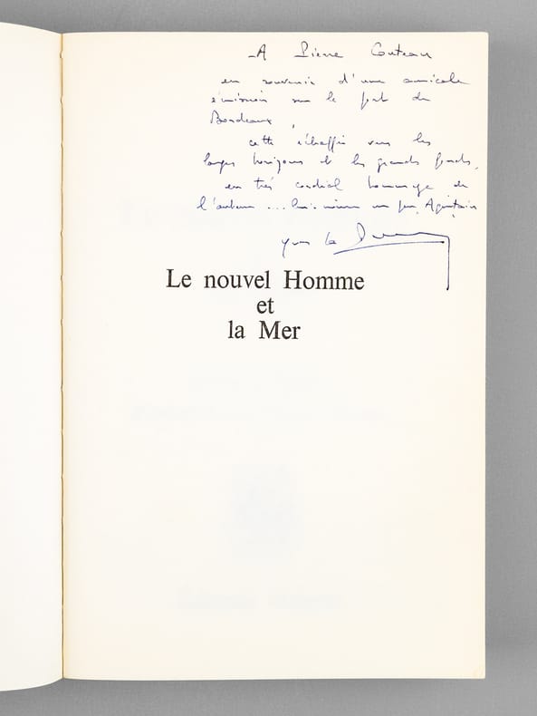 Bon état Pour cet exemplaire avec un bel envoi d'Yves La Prairie : "A Pierre Couteau, En souvenir d'une amicale émission sur le port de Bordeaux, Cette échappée vers les larges horizons et les grands fonds, En très cordial hommage de l'auteur.. lui-même un pur Aquitain". Le dédicataire était un journaliste de la télévision régionale en Aquitaine, spécialisé dans les questions maritimes. L'auteur avait été Directeur Général du CNEXO (Centre National pour l'EXploitation des Océans), créé par le général De Gaulle en 1967. En 1982, le CNEXO fusionna avec L'Institut scientifique et technique des pêches maritimes (ISTPM), pour devenir l'IFREMER (Institut français de recherche pour l'exploitation de la mer).