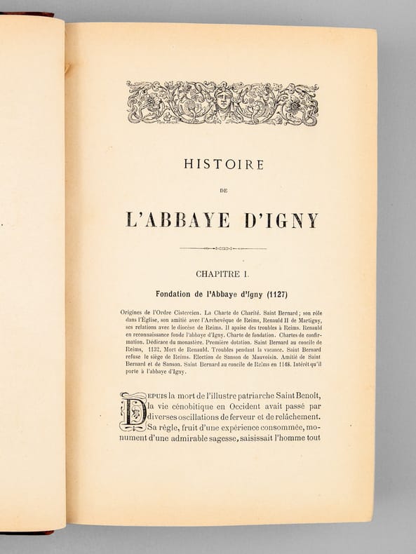Etat très satisfaisant (couv. lég. frottée, bon état par ailleurs) pour cette historie de l'abbaye Notre-Dame d'Igny (Arcis-le-Ponsart, Marne). Dans sa longue histoire, cette abbaye fondée en 1127 fut plusieurs fois détruite. La dernière destruction, sera postérieure de 35 ans au présent ouvrage : en 1918, l'armé allemande en retraite la dynamita volontairement, dans le cadre de sa politique de terre brûlée. Mais, une fois de plus, à partir de 1929, la vie religieuse reprendra et l'abbaye est désormais occupée par une importante communauté de moniales cisterciennes.