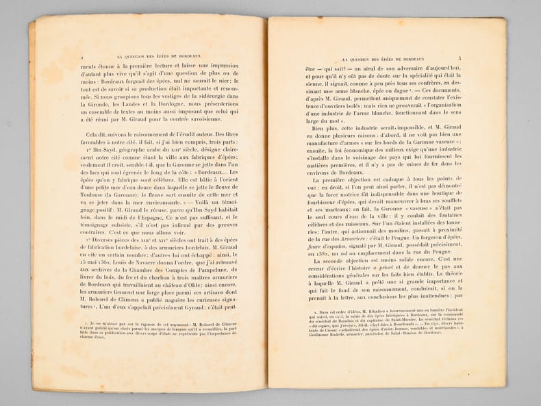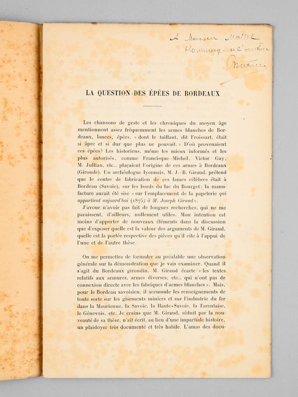 Bon état pour cette petite étude par Jean-Auguste Brutails (1859-1926), qui fut le directeur des Archives départementales de la Gironde, de 1889 à 1926. Les "épées de Bordeaux" évoquées en titre, Font référence aux armes blanches de Bordeaux évoquées dans les textes médiévaux et dont le taillant, dixit le chroniqueur Froissart "était si âpre et si dur que plus ne pouvait".