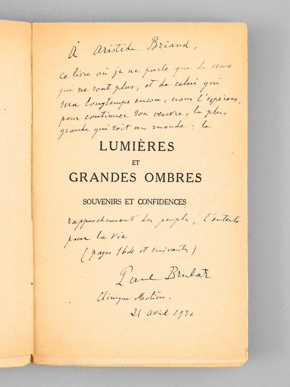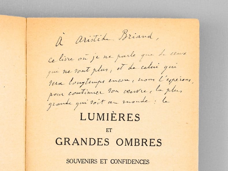 Bon état pour ce livre de souvenirs, avec une belle dédicace à Aristide Briand (1862-1932): " A Aristide Briand, ce livre où je ne parle que de ceux qui ne sont plus, et de celui qui sera longtemps encore, nous l'espérons, pour continuer son œuvre la plus grande qui soit au monde : Le rapprochement des peuples, l'entente pour la vie (pages 164 et suivantes)".