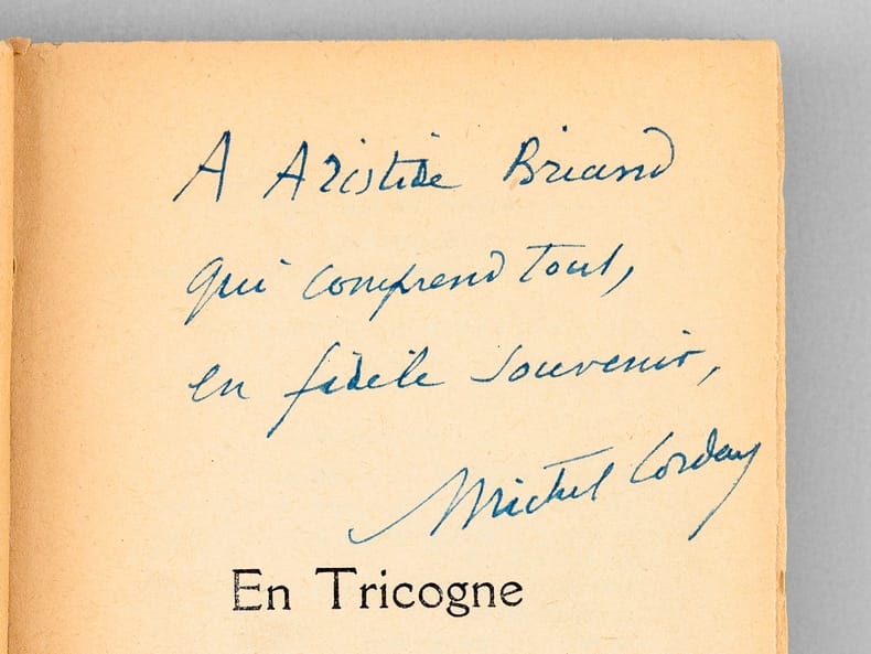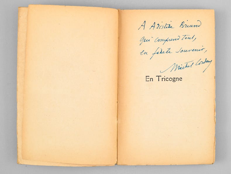 État très satisfaisant pour cet exemplaire dédicacé A Aristide Briand : "A Aristide Briand, qui comprend tout. En fidèle souvenir."