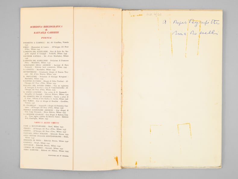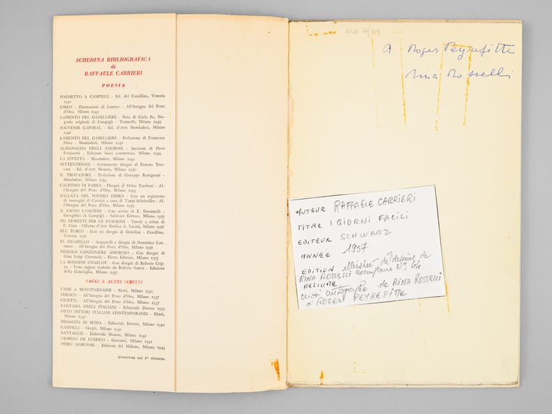Nice sopy (Slight marks on the cover, otherwise a very nice copy", signed and inscribed by illustrator Rina Rosselli to French author Roger Peyrefitte.