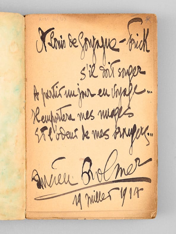 Etat très satisfaisant (couv. frottée, bon état par ailleurs pour cet exemplaire qui mériterait une reliure) pour ce roman. Exemplaire avec un étonnant envoi de l'auteur à Louis de Gonzague-Frick : "A Louis de Gonzague-Frick. S'il doit songer à partir un jour en voyage... il emportera mes nuages et l'odeur de mes orages... 19 juillet 1914. Cette dédicace prend une tonalité tragique quand on considère sa date, qui précède de peu le déclenchement de la Première Guerre Mondiale. Lucien Rolmer y perdra la vie (en 1916, à Verdun). Le dédicataire quant à lui, le poète Louis de Gonzague Frick (1883-1958), survivra au conflit.