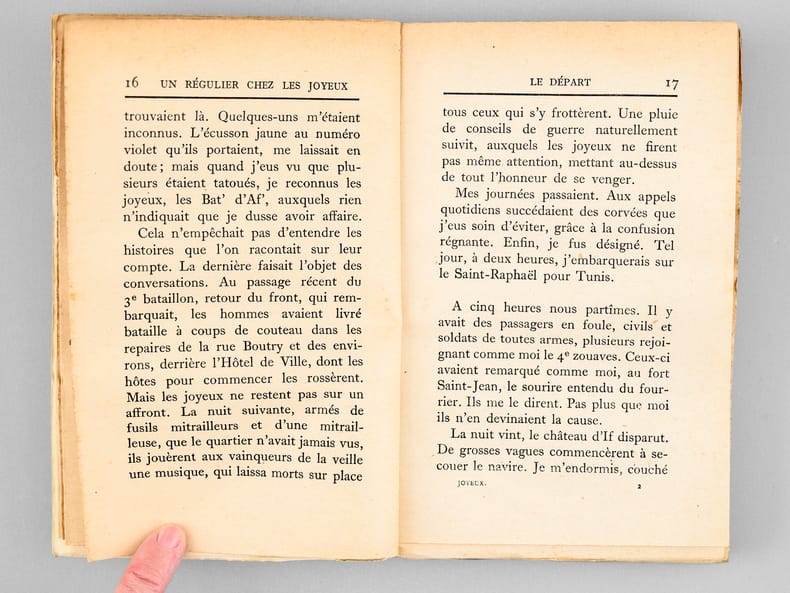 Bon état. Pour information, dans l'Armée française en Afrique, le surnom de "réguliers" désignait les non-légionnaires. Quant aux "Joyeux", il s'agissait de ceux qui étaient passés par le Bat d'Af.. Un ouvrage au ton léger, par un auteur qui eut un parcours personnel étonnant. Issu d'une famille d'intellectuels (son père était agrégé de philosophie), très catholiques et originaire de Savoie, après des études à Louis-le-Grand, il s'engagea en 1916 dans les Chasseurs Alpins. Blessé et décoré, il ne fut pas pas démobilisé dès la fin du conflit, mais fit un séjour de "volontaire désigné nominativement" pour aider à l'encadrement des troupes de l'Armée d'Afrique. Cette expérience est le sujet du présent livre. Il verra de nouveau le feu pendant la Seconde Guerre Mondiale, notamment sur le Chemin des Dames où, fait curieux, il avait déjà combattu à l'automne 1917. Plus étonnant encore, en 1928, Joseph Dimier entra en religion comme moine trappiste, sous le nom de Père Anselme. Ordonné prêtre en 1932, il deviendra un spécialiste de l'art cistercien. Il passa les 30 dernières années de sa vie à l'abbaye Notre-Dame de Scourmont (Chimay, Belgique]. Ouvrage peu courant.