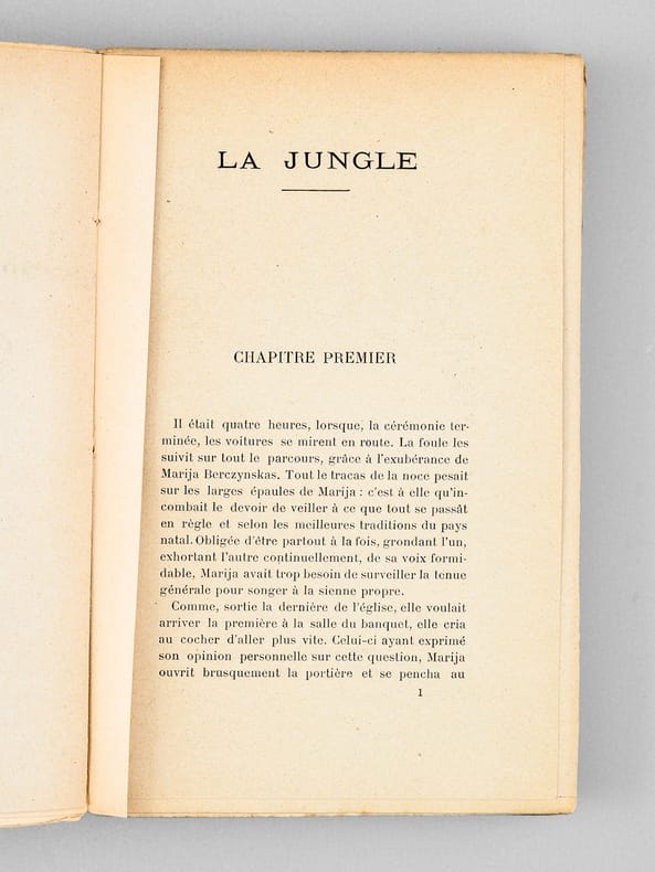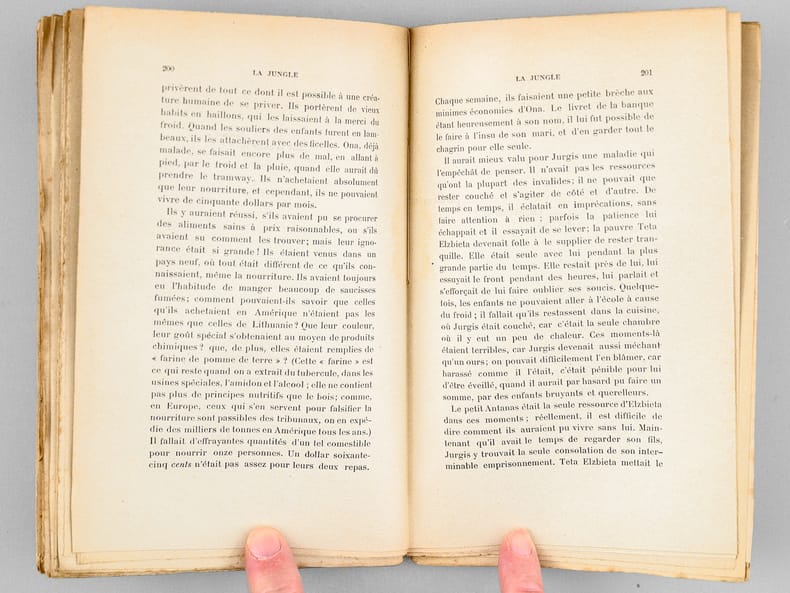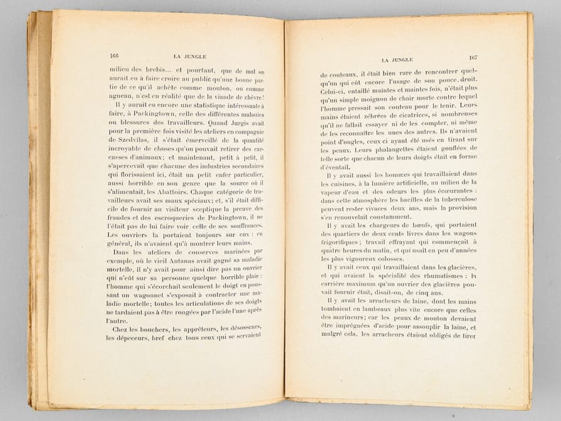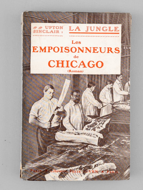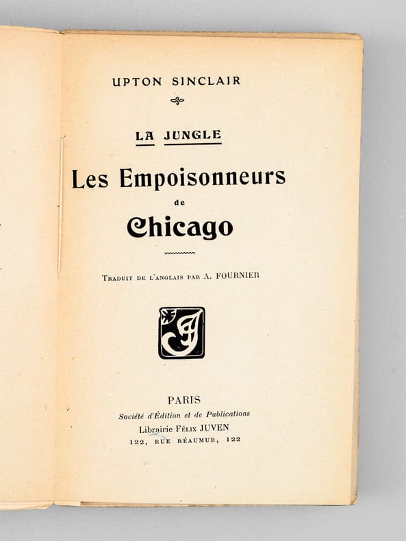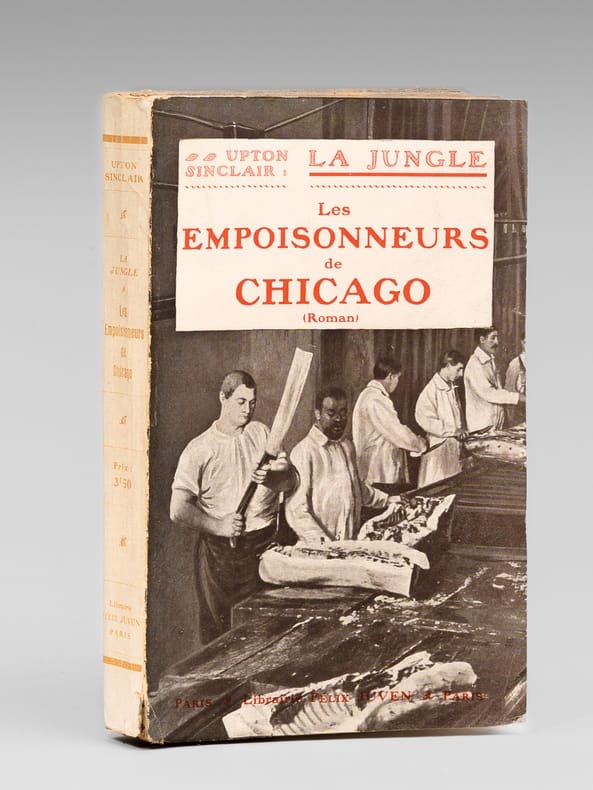 Bon état (couv. lég. frottée, petite manque en bas de dos, très bon état par ailleurs) pour ce rare exemplaire de l'édition originale française du roman qui apporta la célébrité à l'écrivain Upton Sinclair. Dans ce livre, Sinclair raconte le drame d'une famille d'immigrants venus de Lituanie, confrontés aux pratiques des abattoirs de Chicago. Cet ouvrage, en mettant en lumière les pratiques de ces abattoirs, suscita le création d'une commission d'enquête fédérale (la commission Neill-Reynolds), qui aboutit à la loi dite FMIA (Federal Meat Inspection Act) de 1906. Cette loi permit enfin de commencer à combattre les pratiques mafieuses de la Meat Packing Industry de Chicago et d'ailleurs.