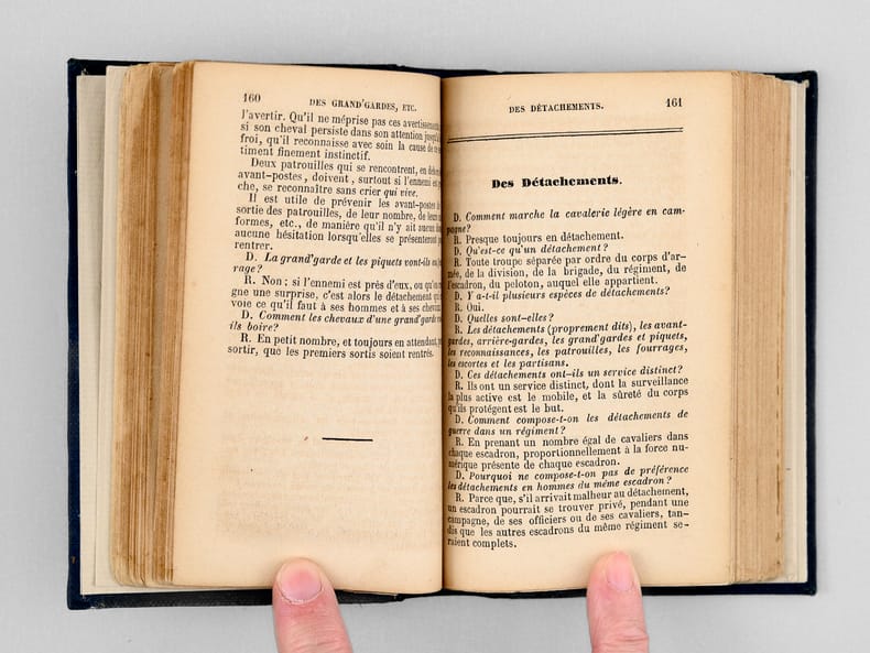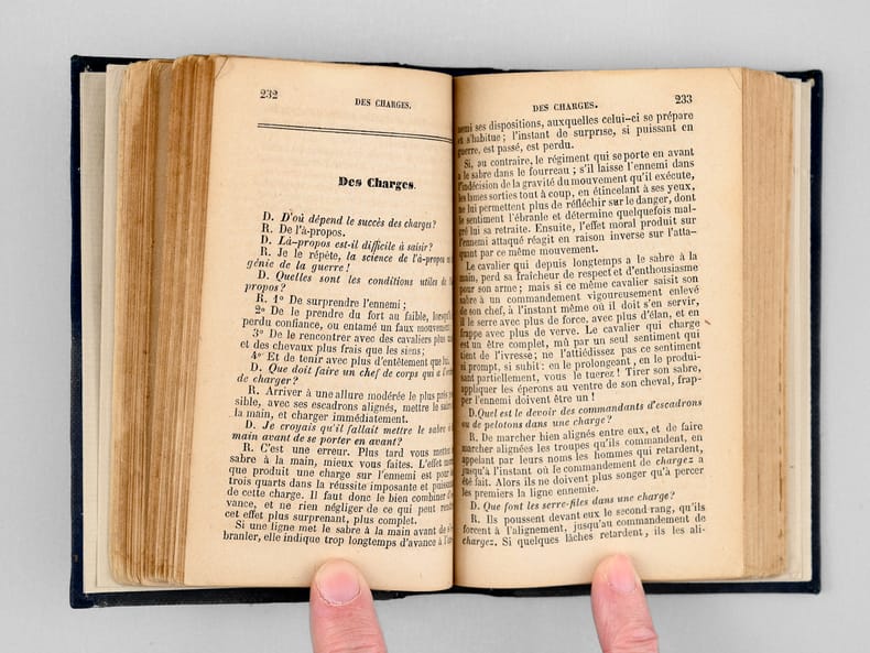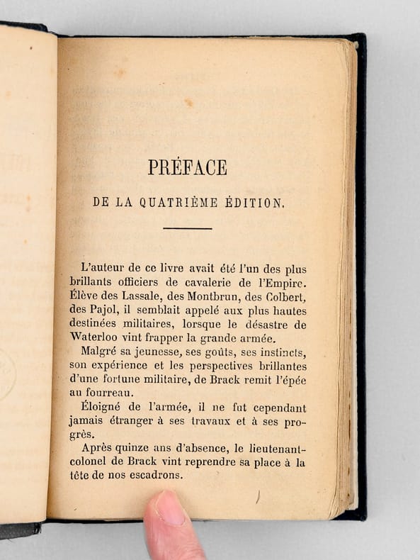 Excellent traité de cavalerie militaire, entrecoupé de souvenirs des campagnes napoléoniennes. L'originale de ce curieux ouvrage parut en 1831, et aucune de ses rééditions n'est vraiment commune : il s'agit à la fois d'un catéchisme complet à l'usage du cavalier en campagne, expliquant tout par questions et réponses ; et d'un livre de souvenirs, puisque chaque démonstration est appuyée sur les anecdotes des campagnes de l'Empire auxquelles l'auteur a participé sous les généraux Lasalle, Pajol et Colbert (1809 en Autriche, 1812 en Russie, 1813 en Saxe, 1814 en France). Ce texte toujours considéré par les historiens du cheval et de la cavalerie comme un des plus complets sur le sujet. Outre les considérations purement militaires, on y trouve une foule de détails inhabituels sur la monte et l'utilisation des chevaux ainsi que sur leurs soins en campagne. Désormais les frais d'envoi sont de 6 € seulement pour les livres jusqu'à 1 kg (colissimo suivi), pour la France métropolitaine.