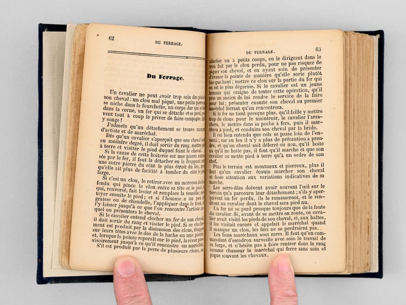 Très bon état pour ce traité de cavalerie, publié pour la première fois en 1831. L'auteur, qui avait servi Napoléon de 1815 jusqu'à Waterloo, commanda notamment l'école de cavalerie de Saumur.