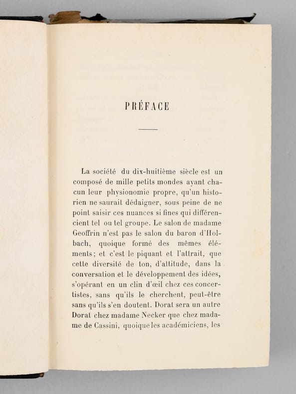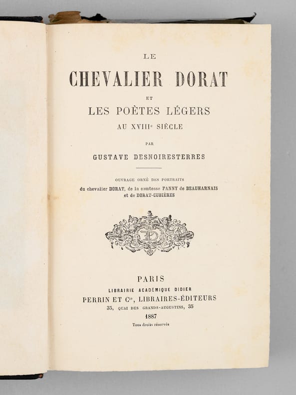 Ouvrage orné des portraits du chevalier Dorat, de la comtesse Fanny de Beauharnais et de Dorat-Cubières, 1 vol. fort in-12 reliure demi-chagrin noir, dos à 5 nerfs, Librairie Académique Didier, Perrin et Cie, Libraires-Éditeurs, Paris, 1887, XI-468 pp. avec portrait en frontispice