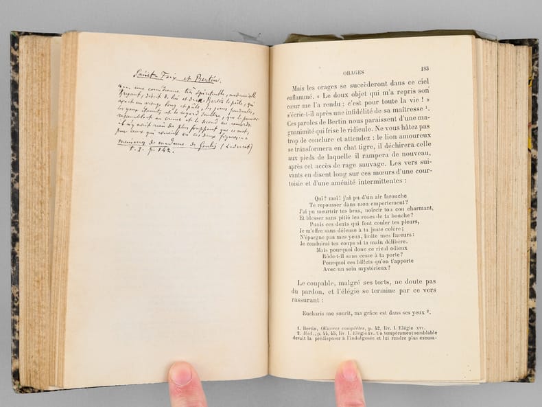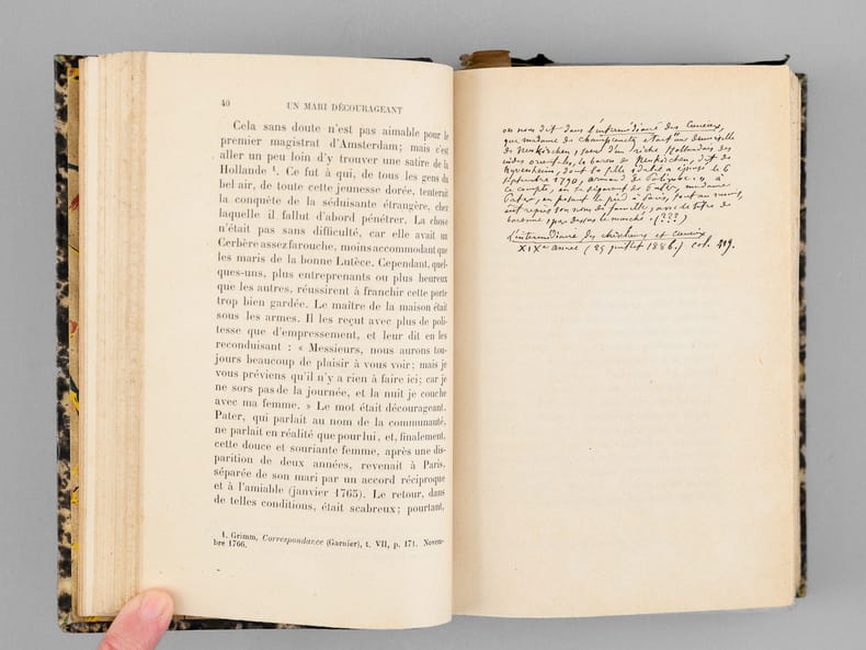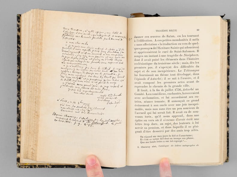 Exemplaire unique de l'auteur, qu'il a fait relier et entièrement interfolier, pour lui permettre d'y rédiger ses corrections et ajouts. Gustave Desnoireterres a fortement enrichi l'exemplaire de ses notes autographes, parfois portées sur des feuillets volants. "M. Desnoiresterres s’est beaucoup occupé du XVIIIe siècle, de ses mœurs et de ses célébrités. Il en a scruté le côté intime avec talent et fait revivre avec habileté l’intéressante physionomie" (Larousse, GDU, VI, 573). Bon état (un seul des 3 portraits signalés) pour ce remarquable exemplaire enrichi par l'auteur. Vicaire, III, 221