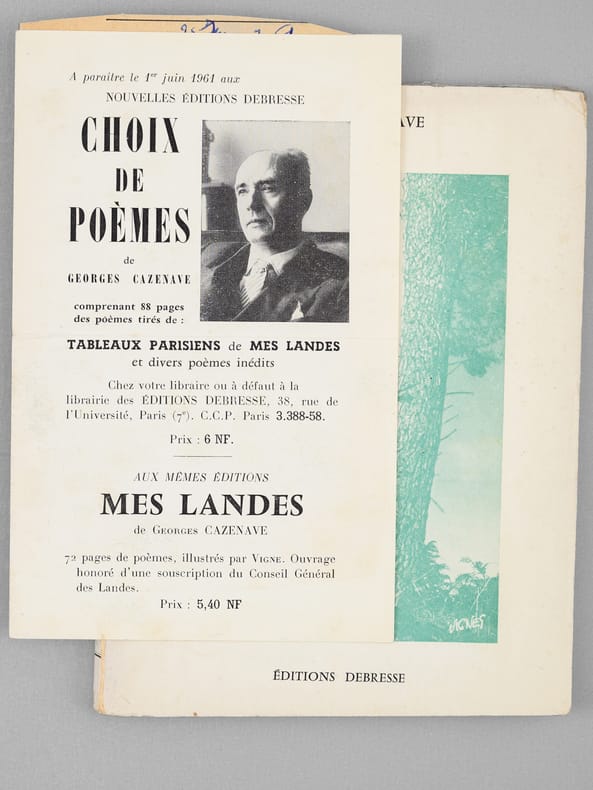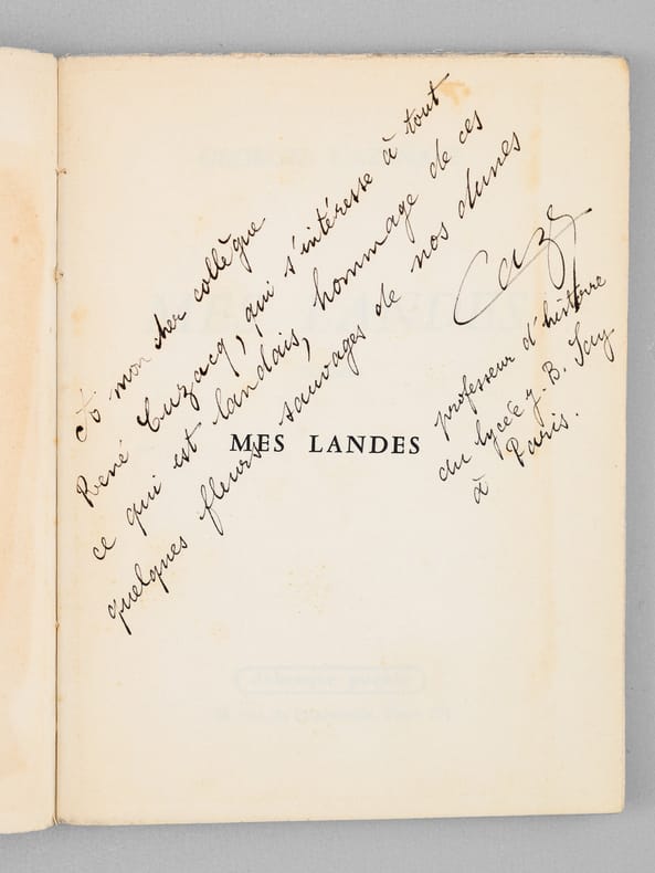 Bel envoi de l'auteur, professeur d'histoire au Lycée J.B. Say à Paris, "A mon cher collègue René Cuzacq, qui s'intéresse à tout ce qui est landais, hommage de ces quelques fleurs sauvages de nos dunes". Bon état (couv. lég. frottée)