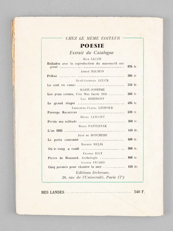 1 vol. in-12 br., Editions Debresse, Debresse-poésie, Paris, 1959, 70 pp.