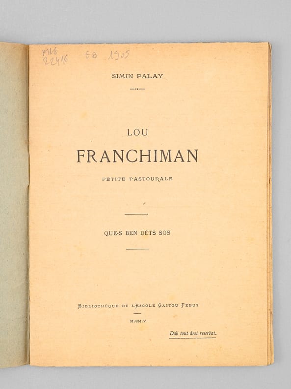 Rare exemplaire de la première réédition signalée de l'édition originale de 1895. Bon état. (Cf. Francés Pic, « Ensag de bibliographia de las obras editadas de Simin Palay", pp. 11)