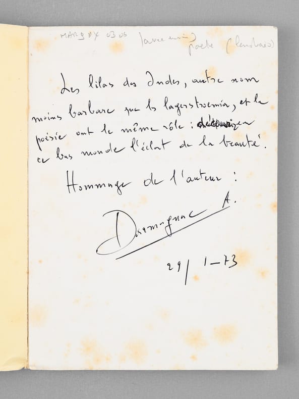 Bel envoi de l'auteur : "Les lilas des Indes, autre nom moins barbare que les lagestroemia, et la poésie ont le même rôle : découvrir en ce bas monde l'éclat de la beauté". Etat très satisfaisant