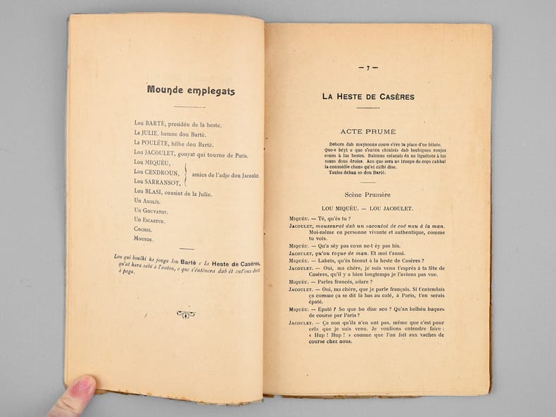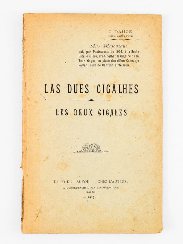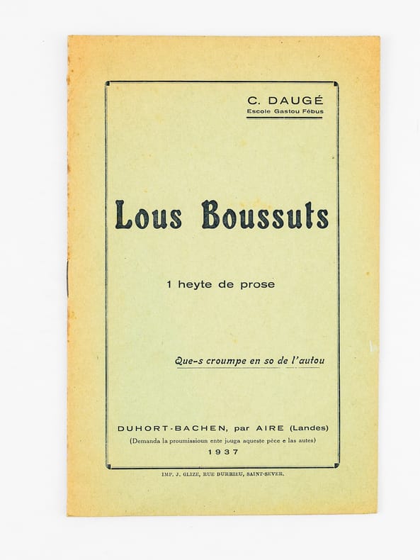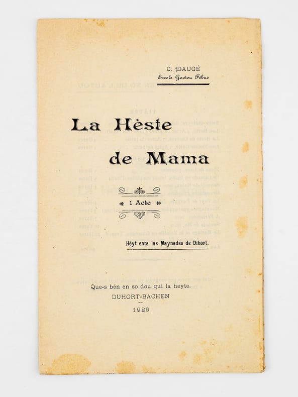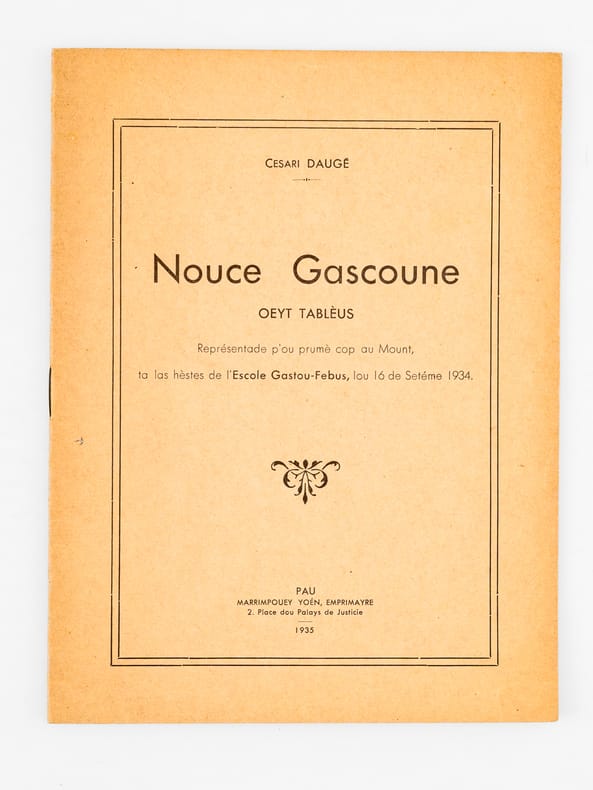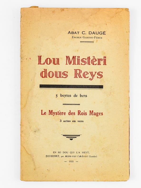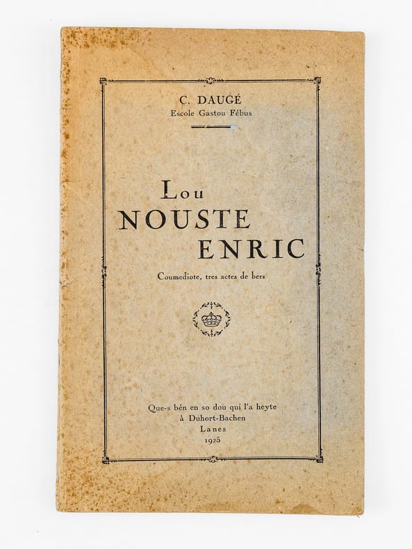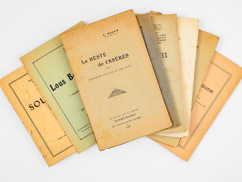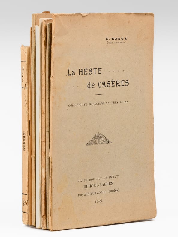9 vol. et brochures in-8 : La Heste de Casères. Coumédiote gascoune en tres actes ; Escole Gastou Fébus ; Duhort-Bachen, par Aire-sur-Adour (Landes), 1924 [ On joint : ] Lou Nouste Enric. Coumediote, tres actes de bers ; Escola Gastou Fébus ; Lanes, 1925 [ On joint : ] La Hèste de Mama. 1 Acte ; Hèyt enta las Maynades de Dihort ; Escole Gastou Fébus ; Duhort-Bachen, 1926 [ On joint : ] La dues Cigalhes. Les deux Cigales. En so de l'Autour. Chez l'Auteur, A Duhort-Bachen, par Aire sur Adour, 1927 [ On joint : ] Lou Castet de Maubezin. Le Château de Mauvezin ; J’ay belle dame (Cry du Château) (Gaston-Fébus 1379) ; Escole Gastou Fébus ; Deuxième édition ; Chateau de Mauvezin (Hautes-Pyrénées) et chez l’auteur, à Duhort-Bachen, par Aire-sur-Adour (Landes), 1928 [ On joint : ] Lou Mistèri dous Reys. Le Mystère des Rois Mages ; 3 beytes de bers ; 3 actes en vers ; Escole Gastou-Fébus ; Duhort, par Aire-sur-l'Adour (Landes), 1935 [ On joint : ] Nouce Gascoune. Oeyt tablèus ; Représentade p’ou prumè cop au Mount, fa las hèstes de l’Escole Gastou-Febus, lou 16 de Setéme 1934 ; Marrimpouey Yoén, Emprimayre, Pau, 1935 [ On joint : ] Lous Boussuts. 1 heyte de prose ; Escole Gastou Fébus ; Imp. J. Glize, Saint-Sever ; Duhort-Bachen, par Aire (Landes), 1937 [ On joint : ] Soucouc. Escole Gastou-Fébus ; En so de l’Autou, Duhort, par Aire-sur-l’Adour, (Landes), 1939