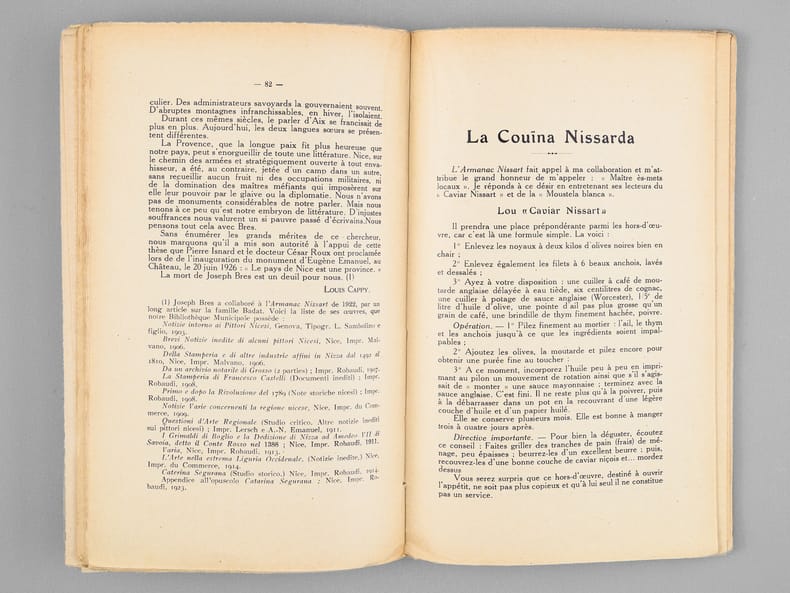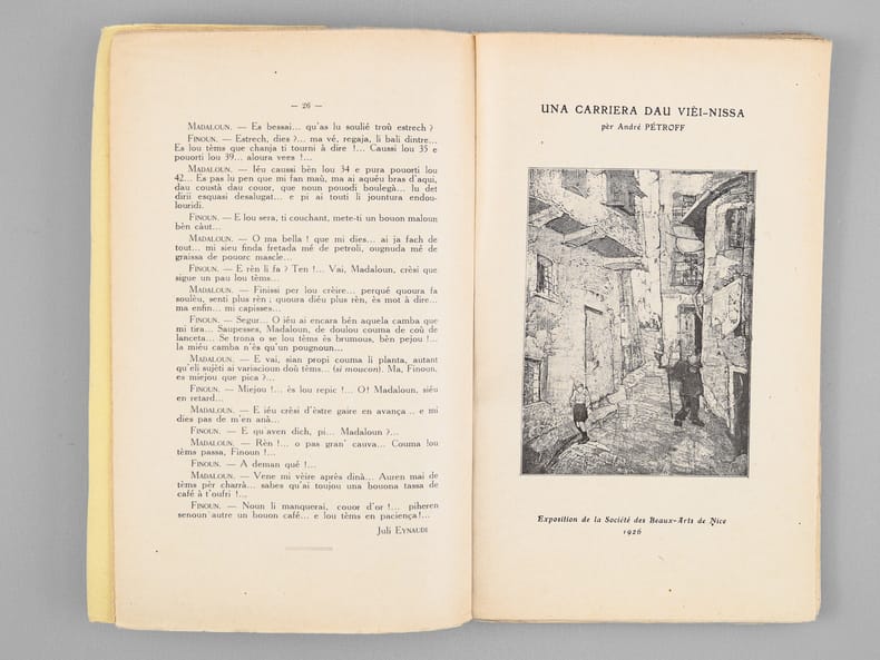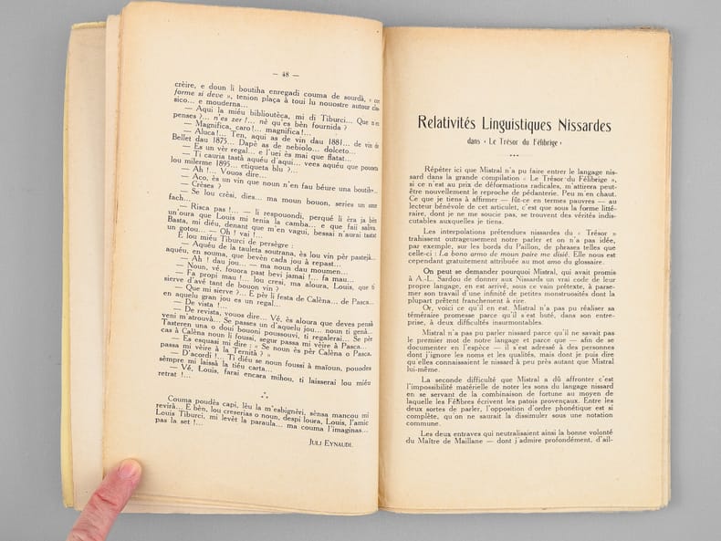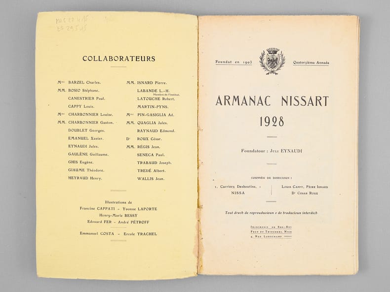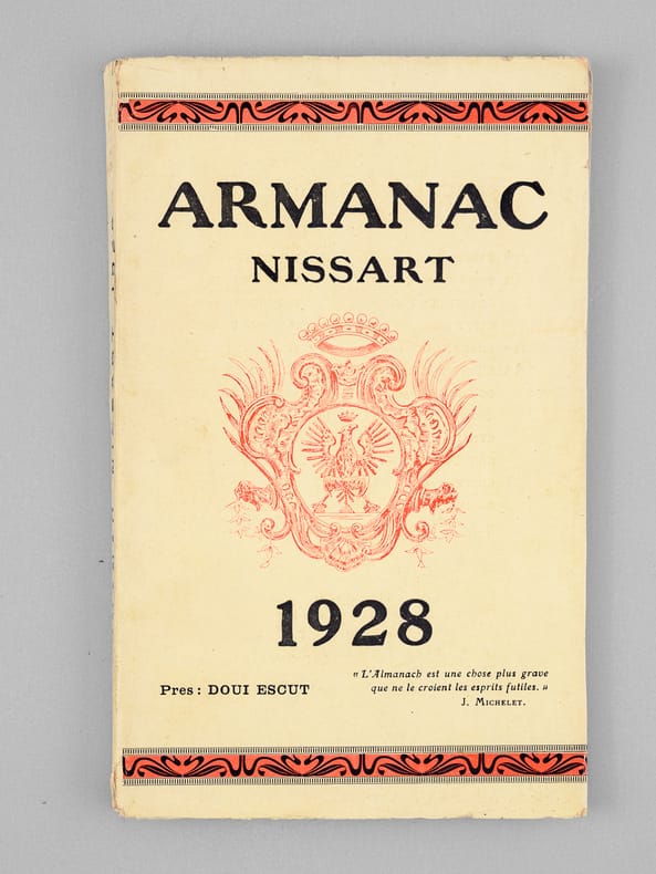 Cet "Armanac niçart" (almanach niçois) connut une publication très irrégulière. Il paraît d'abord en 1903 mais s'interrompt deux ans en 1905 et 1906, cesse de 1915 à 1919 puis reprend jusqu'en 1922, avant de s'interrompre longuement et de ne reprendre qu'avec ce numéro de 1928. Etat très satisfaisant (forts accrocs en couv. au second plat, petit mq. au dos en queue, bon état par ailleurs).