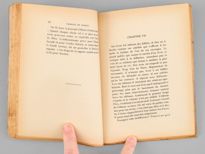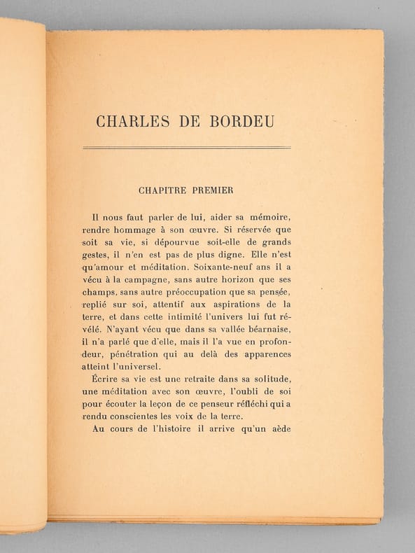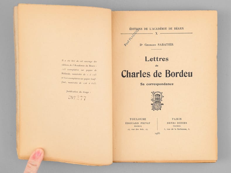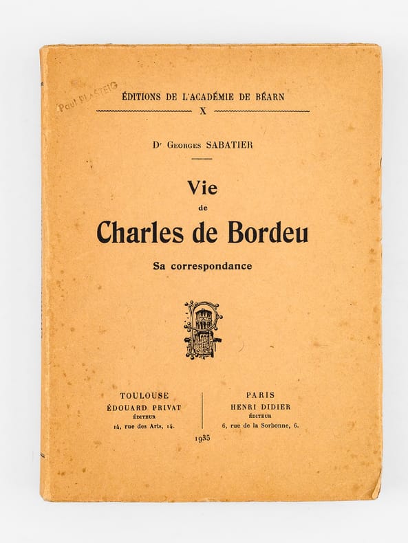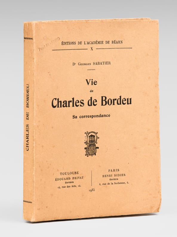 Toulouse - Paris Edouard Privat / Henri Didier, Editeur 1927 in 8 (20x14,5) 1 volume broché, 170 pages. Editions de l'Académie de Béarn, X. Charles de Bordeu, 1857-1926, arrière-petit-fils de Théophile de Bordeu. Tirage limité à 625 exemplaires numérotés, celui-ci un des 125 exemplaires numérotés sur papier de Hollande. Bel exemplaire ( Photographies sur demande / We can send pictures of this book on simple request )