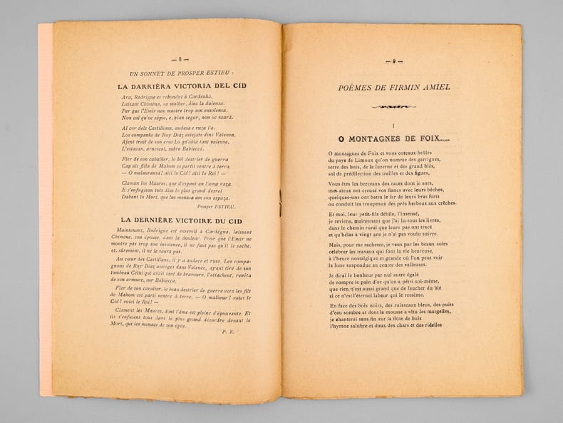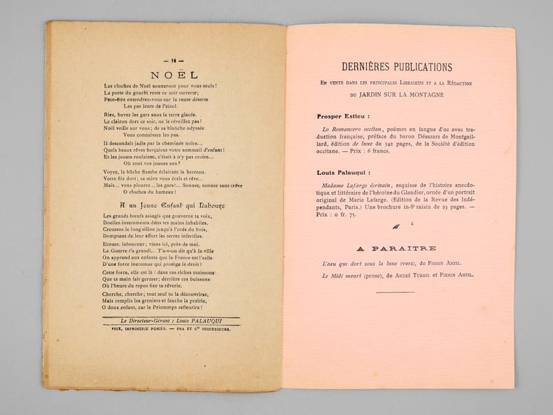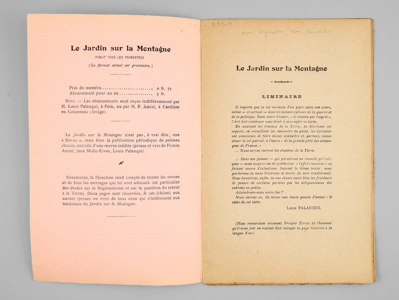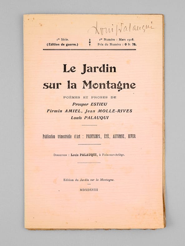 1 brochure in-8, Publication trimestrielle d'Art : Printemps, Été, Automne, Hiver ; Direction : Louis Palauqui, à Foix-sur-Ariège, Edition du Jardin sur la Montagne, MDXDXVIII (1918), 14 pp.