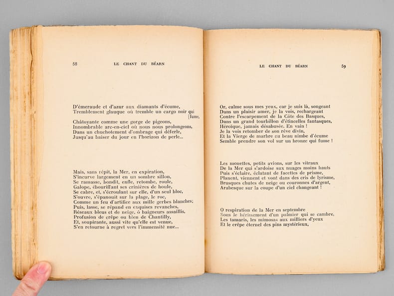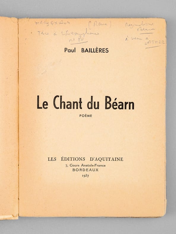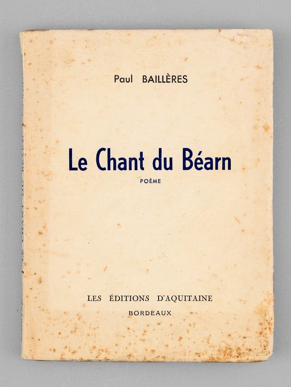De père béarnais et de mère basque, Paul Baillières (1897-1972) passera l'essentiel de sa vie à Orthez. Influencé par la poésie de Francis Jammes et la rencontre de Louis Ducla en 1925, Paul Baillières va passer 13 ans d'écriture avant de publier le présent recueil de 20.000 vers. Etat très satisfaisant (couv. un peu frottée avec rouss., bon état par ailleurs).