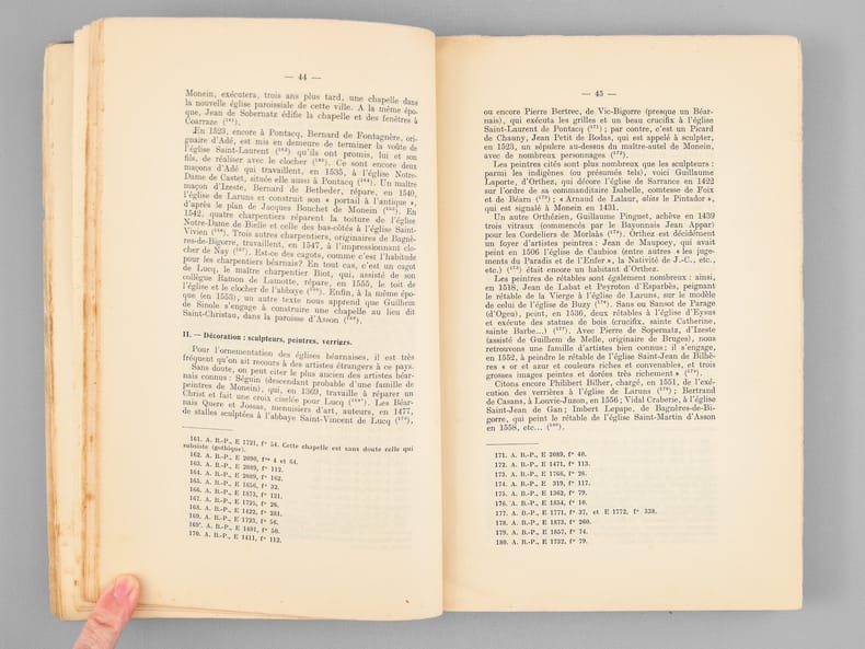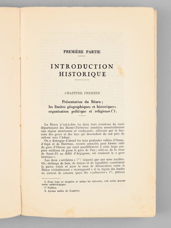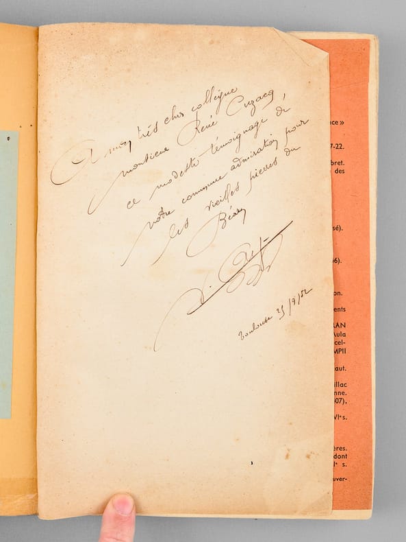 Exemplaire bien complet du long errata et dédicacé par l'auteur "à mon très cher collègue monsieur René Cuzacq, ce modeste témoignage de notre commune admiration pour les vieilles pierres du Béarn". L'exemplaire a été annoté, conformément à son habitude, par le professeur Cuzacq. Etat très satisfaisant (couv. un peu frottée, qq. annotations) pour cet intéressant exemplaire de belle provenance.