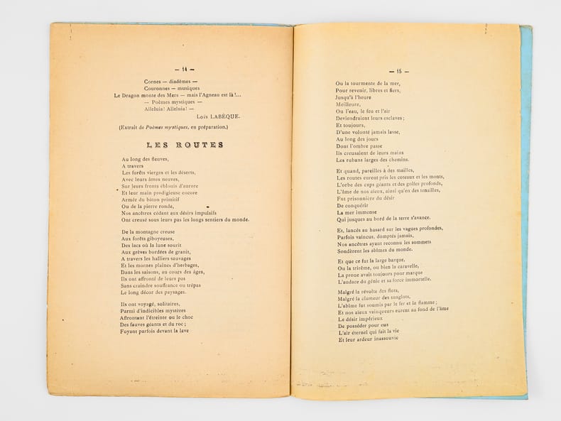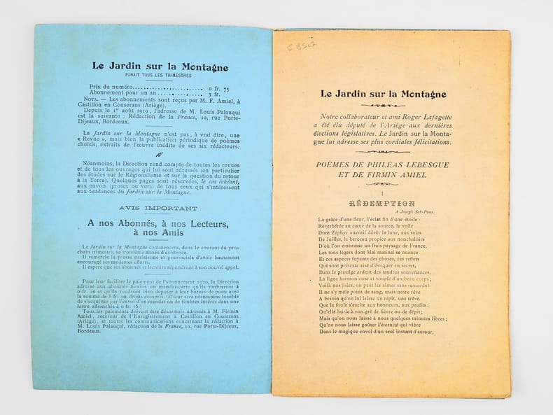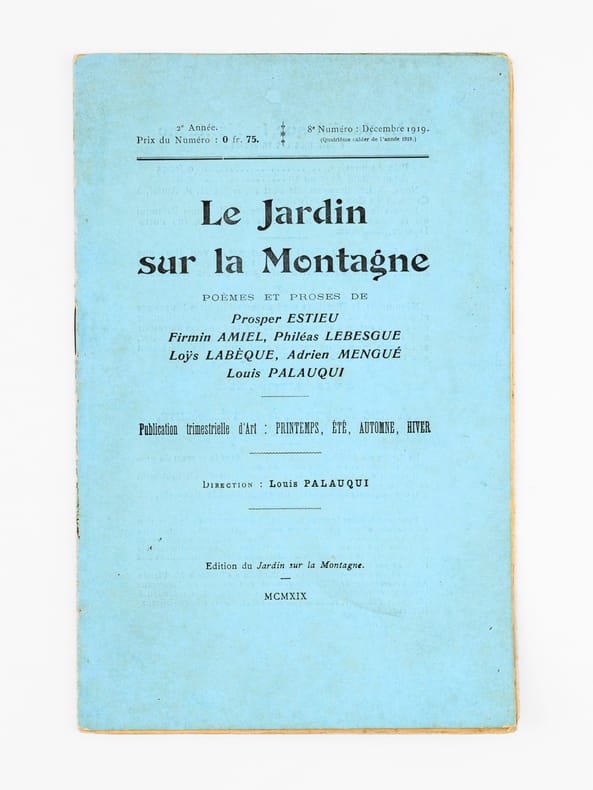 Poèmes et proses, 2e Année, 8e Numéro : Décembre 1919, Publication trimestrielle d'Art : Printemps, Été, Automne, Hiver, 1 brochure in-8, Direction : Louis Palauqui, à Foix-sur-Ariège, Edition du Jardin sur la Montagne, 1919, 16 pp.