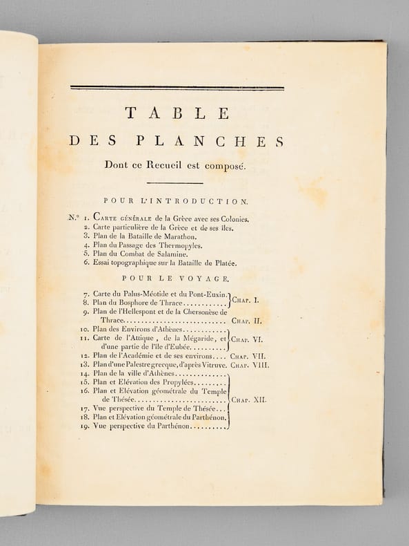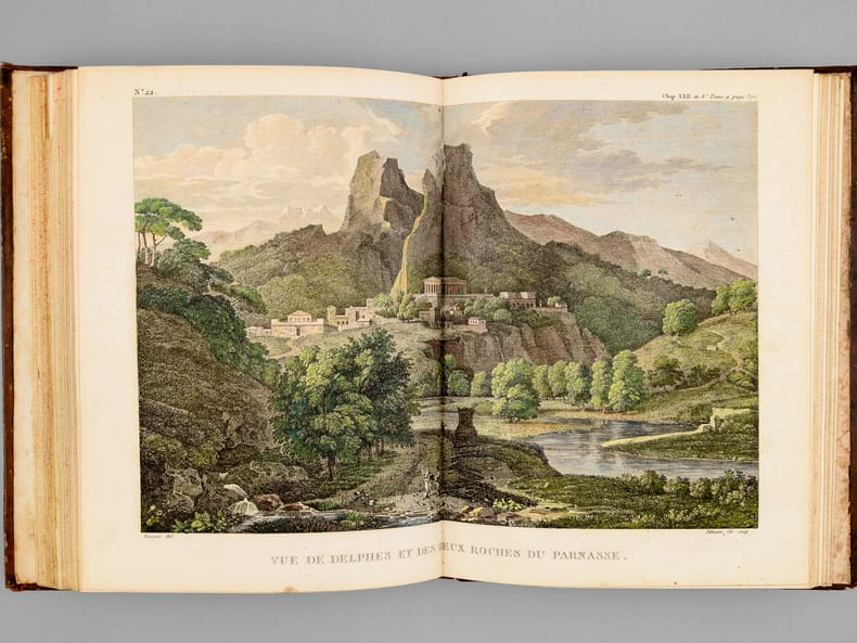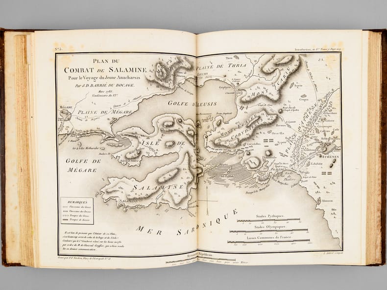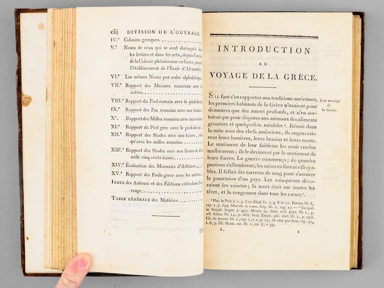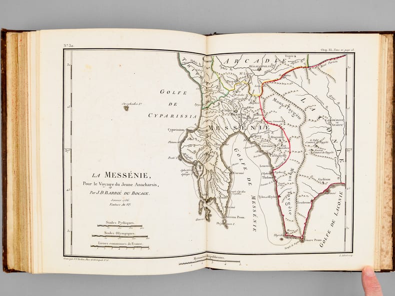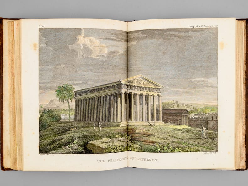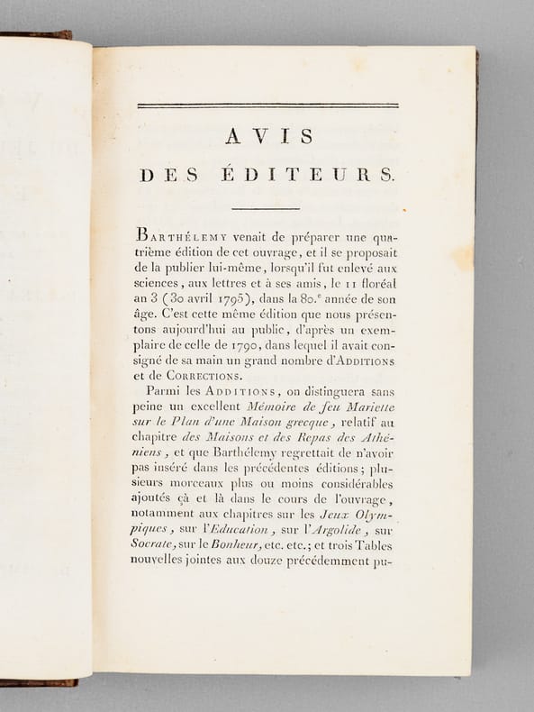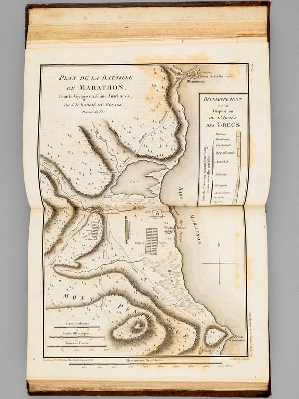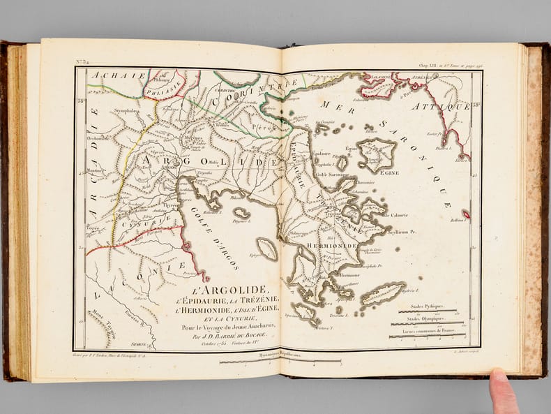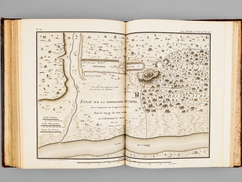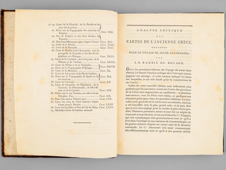 Exemplaire décoratif, signé par l'éditeur Didot le jeune, dont l'atlas recueille 39 belles cartes et vues sans la première carte dépliante de la Grèce, qui manque souvent car parue tardivement, mais avec le numéro 19 bis non signalé dans la table. On trouve le portrait de l'abbé Barthélémy dans le premier volume de texte, mais pas dans l'atlas. La plupart des vues ont été légèrement rehaussées au pastel, ce qui est d'un bel effet, certaines cartes sont légèrement rehaussées en couleurs. On relève plusieurs travaux de restaurations anciens, les gardes volantes ont été systématiquement contrecollées sur les gardes fixes et certains feuillets ont été maladroitement remontés, mais l'ensemble reste agréable (qq. frott. en reliure., traces d'anciennes mouill. en dos de l'atlas, anciennes restaurations signalées, bon état par ailleurs).