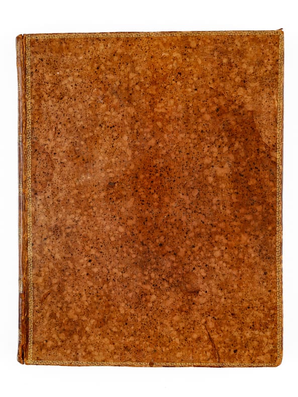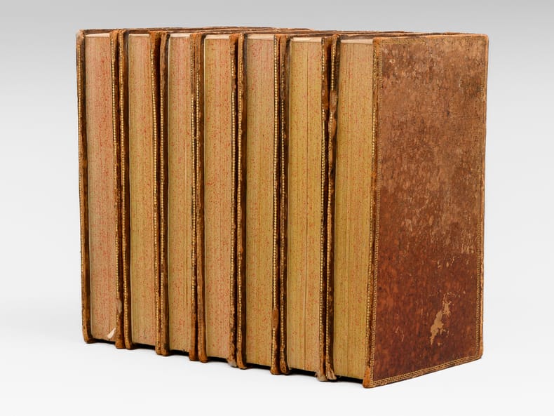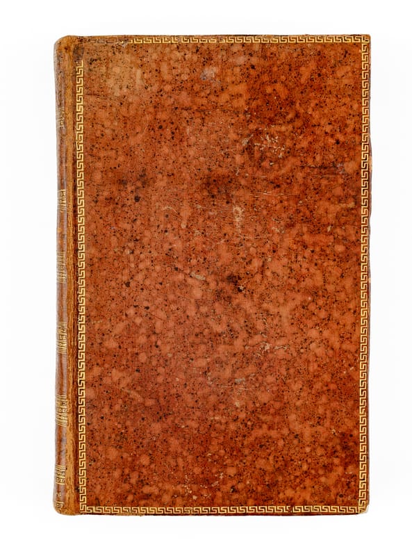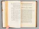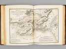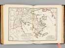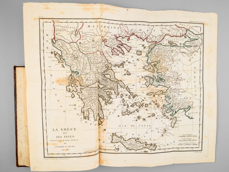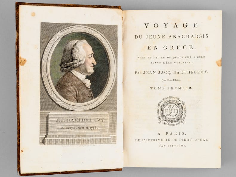 Quatrième édition ("Nouvelle Edition" pour l'Atlas) 7 vol. in-8 et 1 vol. d'atlas in-4 reliure de l'époque plein veau moucheté, dos lisses ornés (petits fleurons), grecque dorée en encadrements sur plats, filet sur coupes, De l'Imprimerie de Didot Jeune, Paris, l'an Septième [ 1799-1800], viii-clij-367 pp. avec portrait en frontispice ; VIII-517 pp. ; VIII-496 pp. ; VIII-507 pp. ; VIII-495 pp. ; 3 ff., 454 pp. ; Atlas : 110 pp., avec 39 carte dont carte dépliante ("La Grèce et ses Isles pour le Voyage du Jeune Anacharsis" par J. D. Barbié du Bocage, Août 1788) et vues rehaussées au pastel