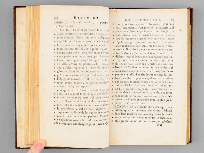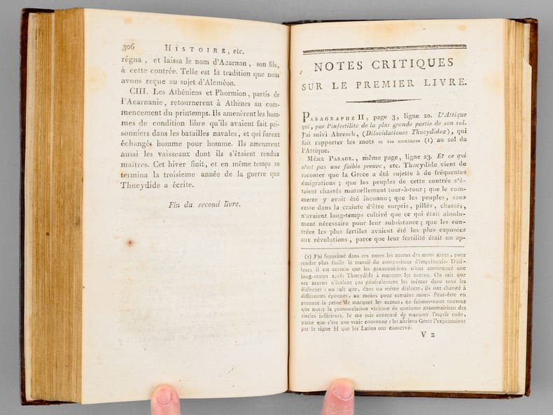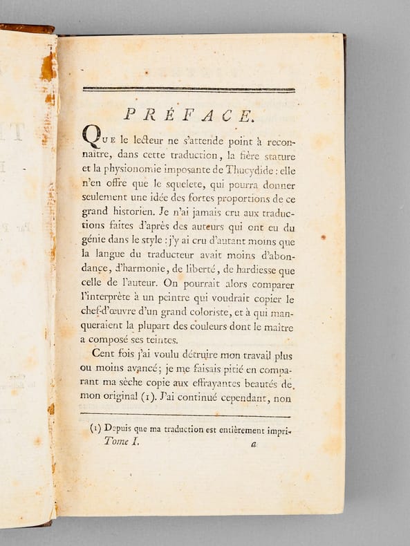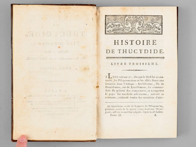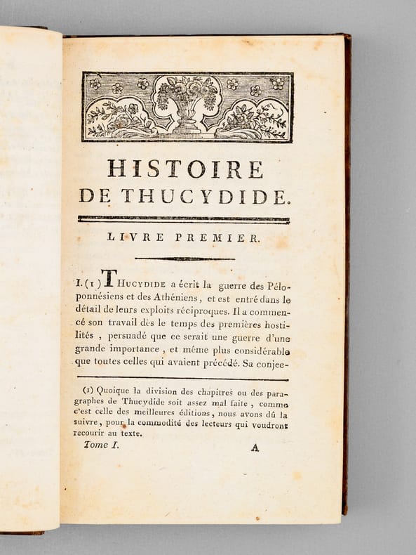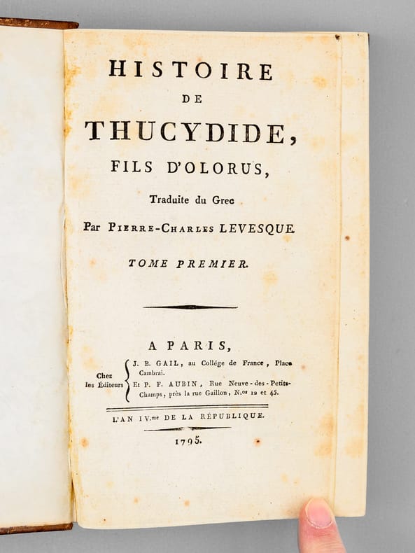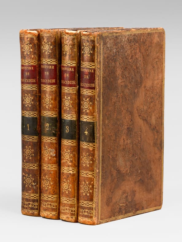 Rare exemplaire bien complet des 4 tomes de cette édition originale de la traduction par Levesque de l'oeuvre de Thucydide, immortel auteur de l'Histoire de la Guerre du Péloponnèse ("la guerre des Péloponnésiens et des Athéniens"). Brunet cite cette traduction avec éloge : 'la meilleure traduction qu'on eût alors de cet historien". Dans sa préface, Pierre-Charles Levesque évoque les traductions de ses prédécesseurs. On relève plusieurs travaux de restaurations anciens, les gardes volantes ont été systématiquement contrecollées sur les gardes fixes et les faux-titres supprimés. Exemplaire modeste (restaurations signalées, reliures frottées avec petits manques en coiffes sup.) de cette rare édition, importante dans l'histoire des traductions française de Thucydide. Prix en l'état. Brunet, V, 847