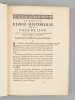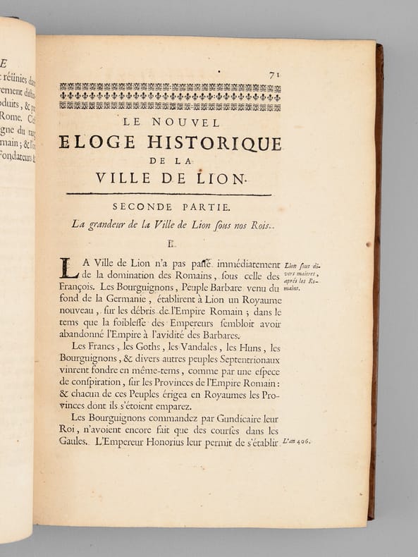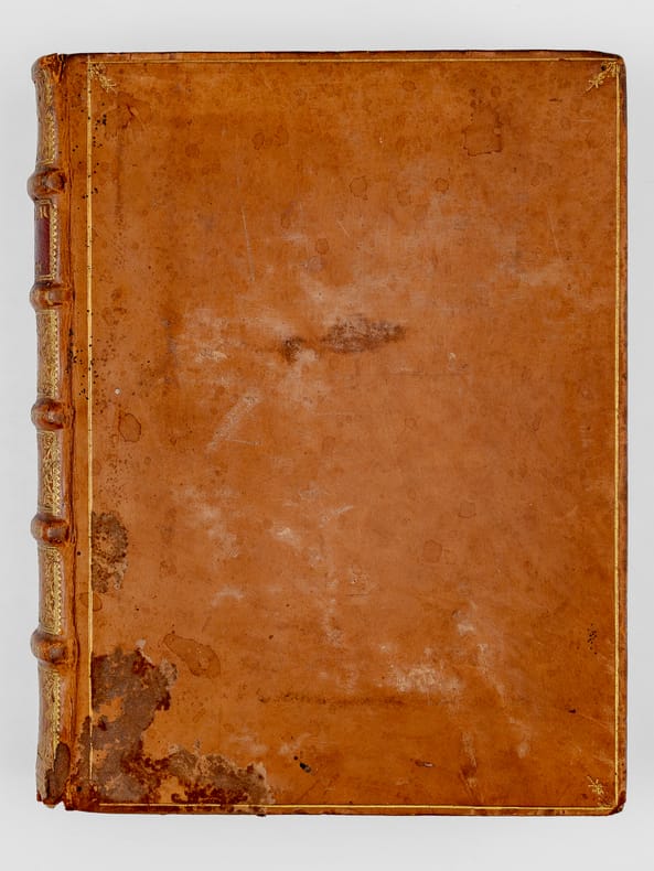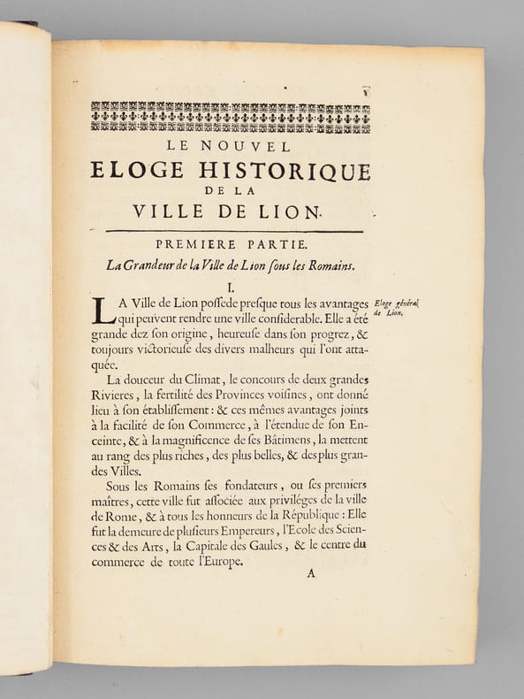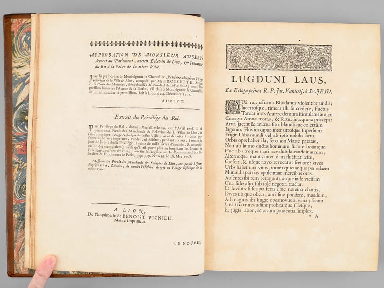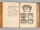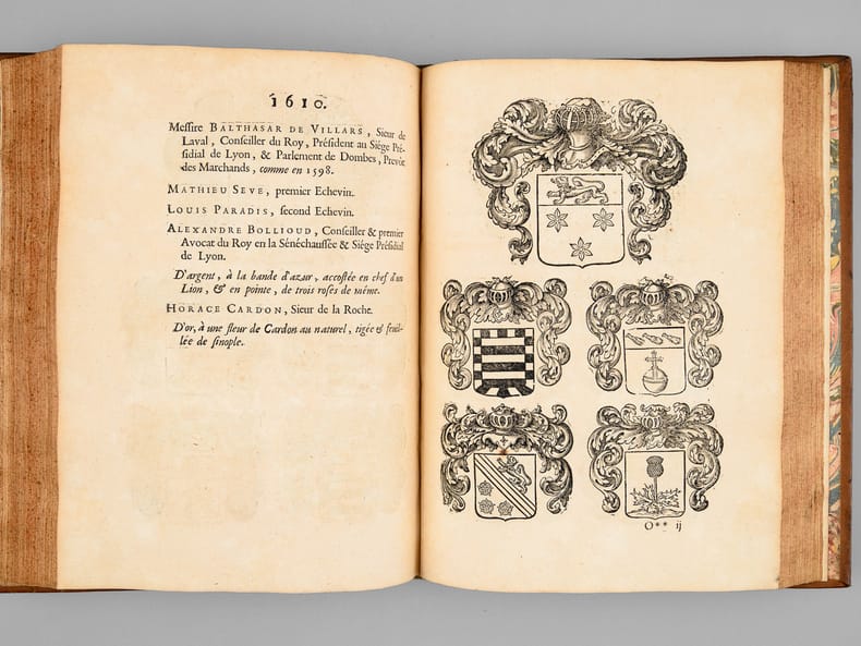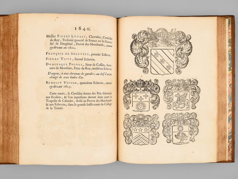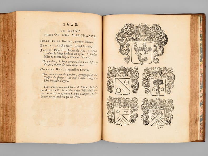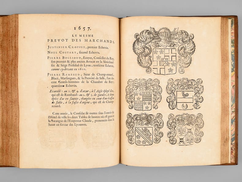 1 vol. in-4 reliure de l'époque plein veau fauve, dos à 5 nerf orné, filet doré d'encadrement en plats avec petits fleurons en écoinçons, roulette dorée sur coupes, tranches rouges, Chez Jean-Baptiste Girin, Lion, 1711, 8 ff., 210 pp. (mal chiffré 201), 76 pp. avec Plan de Lyon à double page gravé par Bouchet, une planche hors texte ("Tombeau des deux amants" par Ferdinand Delamonce), 1 f. et 115 planches gravées in fine de blasons des échevins de 1596 à 1711 (précisément 1 f. avec titre intermédiaire au recto et explication des planches au verso, 114 ff. avec blasons au recto et explication au verso, 1 f. avec blasons et texte en recto-verso)