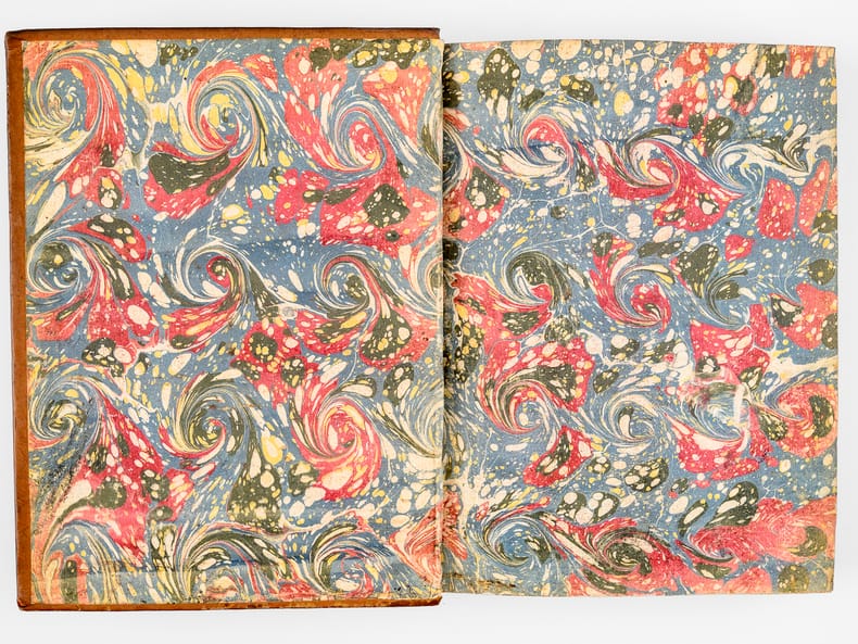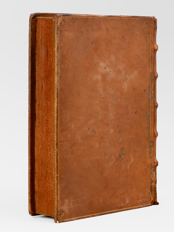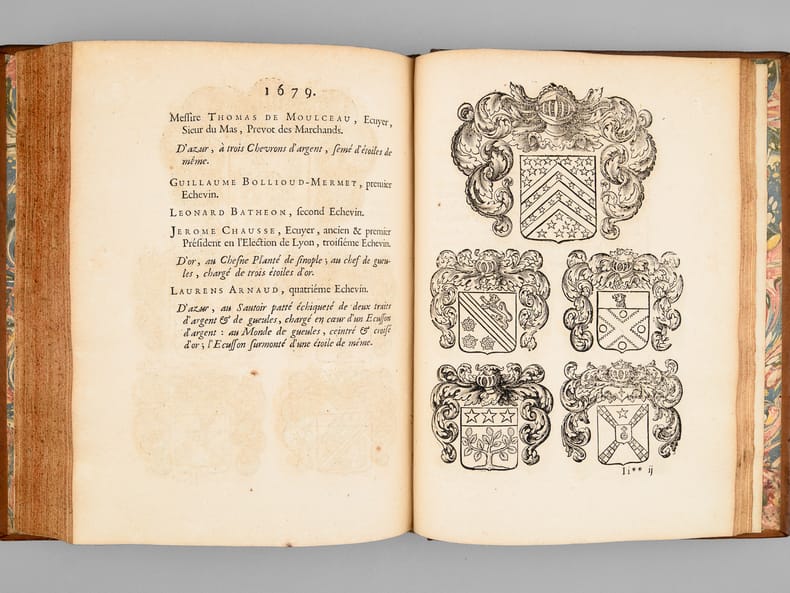 Exemplaire bien complet avec le beau plan de Lyon, la gravure de Bouchet et 115 planches de blasons (blasons du prévôt des marchands de Lyon et des 4 échevins de 1596 à 1711, et 3 blasons supplémentaires). Des planches de blasons furent ajoutées les années suivantes, ce qui explique que leur nombre diffère selon les exemplaires, mais notre exemplaire est parfaitement complet de tous les blasons parus en 1711. Etat très satisfaisant (épidermures en plats, mq. en coiffes, bon état par ailleurs).