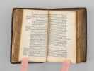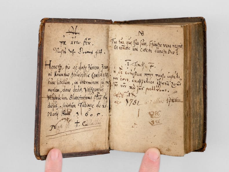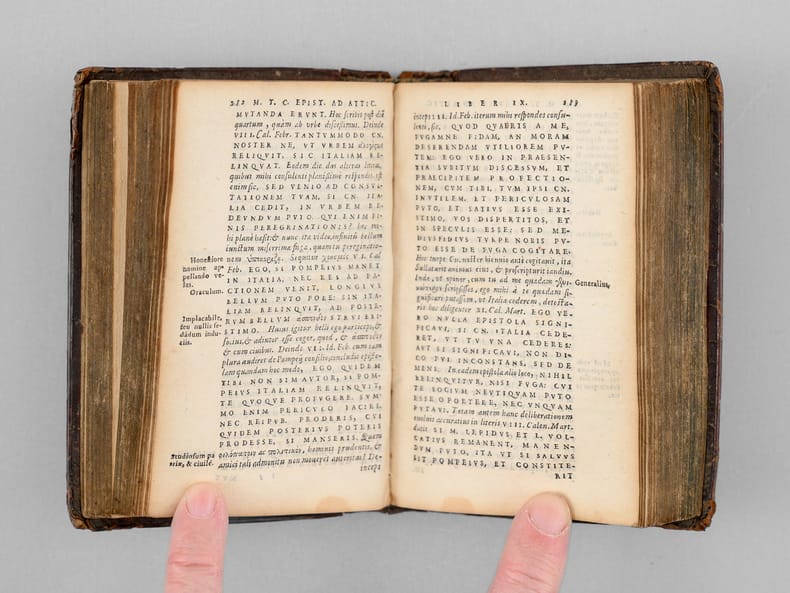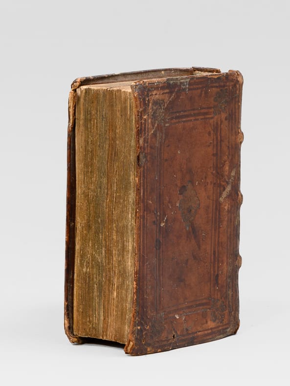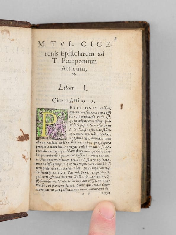 Ce charmant exemplaire des lettres de Cicéron est enrichi en garde d'un superbe ex-dono manuscrit daté du 25 mars 1605, rédigé par un étudiant à l'Université de Tübingen, Wolfgang Schindelin de Blaubeuren, à un autre étudiant Johann Krumm. On peut lire en garde fixe ce texte latin : "Honesto, pio ac docto juveni Joanni Krummio philosophiae Candidato hunc libellum, in interminam sui memoriam, dono dedit, Wolfgangus Schindelin Blavifontanus phiae studiosus. Scriptum Tubingae die 25 Martij Anno 1605" [ "À l’honnête, pieux et savant jeune homme Johann Krumm, candidat en philosophie, Wolfgang Schindelin de Blaubeuren, étudiant en philosophie, a offert ce petit livre en cadeau, en souvenir éternel de lui-même. A Tübingen, le 25 mars 1605" ]. Ce texte latin est précédé d'une annotation en grec ancien : "Ouden aneu theou" et sa traduction en cursive allemande "Nichts ohne Gottes hilf" ["Rien sans Dieur"]. Sur la garde volante, à droite, on peut lire ce texte latin : "Fac tua, quae tua sunt, q [quia] functio vera requirit Et committe uni caetera cuncta Deo" ["Fais ton devoir, ce qui t'incombe, comme la vraie charge l'exige / Et remets tout le reste à Dieu seul"] et un extrait en grec de la Première Epître à Timothée (1 Timothée 4, fin du verset 8) dont voici la traduction "la piété est utile à tout, ayant la promesse de la vie présente et de celle qui est à venir.". On sait que Wolfgang Schindelin (1586-1635) est immatriculé à Tübingen en 1603 ; il sera victime de la peste à Nürtingen en 1635. Johannes Krumm est immatriculé un peu plus tôt, le 28 avril 1602. Qualifié de "Philosophiae Candidatus", il était sur le point de passer sa maîtrise avant d'entrer dans le grade supérieur. Cette édition des Lettres à Atticus de Cicéron s'insère très certainement dans l'édition imprimée par Symphorien Barbier et qui fut partagée en J. Frellon et Antoine Vincent des Oeuvres de Cicéron. Baudrier indique : 'Ces libraires ont donné, en 1560, deux éditions de Cicéron, l'une in-8 en 12 volumes et l'autre in-16, qu'ils rafraîchirent en 1562. Je n'ai pu, malgré de longues recherches, en retrouver un exemplaire complet" (Baudrier, V, 251). Bon état (petits mq. en dos et coiffes, premier feuillet de garde volante un peu faible, premier lettrine coloriée) pour ce remarquable témoignage typique des relations étudiantes à l'Université de Tübingen au tout début du XVIIe siècle. Voici une traduction soignée de votre notice bibliographique, respectant scrupuleusement votre consigne de ne pas traduire les passages originaux en latin et en grec. This charming copy of Cicero's letters is enriched on the endpaper by a very fine manuscript ex-dono dated March 25, 1605, written by a student at the University of Tübingen, Wolfgang Schindelin of Blaubeuren, to another student, Johann Krumm. On the pastedown, one can read this Latin text: "Honesto, pio ac docto juveni Joanni Krummio philosophiae Candidato hunc libellum, in interminam sui memoriam, dono dedit, Wolfgangus Schindelin Blavifontanus phiae studiosus. Scriptum Tubingae die 25 Martij Anno 1605". This Latin text is preceded by an annotation in Ancient Greek: "Ouden aneu theou" and its translation in German cursive "Nichts ohne Gottes hilf". On the flyleaf, to the right, one can read this Latin text: "Fac tua, quae tua sunt, q [quia] functio vera requirit Et committe uni caetera cuncta Deo" and an extract in Greek from the First Epistle to Timothy (1 Timothy 4, end of verse 8). It is known that Wolfgang Schindelin (1586-1635) matriculated at Tübingen in 1603; he would later fall victim to the plague in Nürtingen in 1635. Johannes Krumm matriculated slightly earlier, on April 28, 1602. Described as a "Philosophiae Candidatus", he was on the verge of completing his Master's degree before entering a higher rank. This edition of Cicero's Letters to Atticus most certainly belongs to the edition printed by Symphorien Barbier, which was shared between J. Frellon and Antoine Vincent for the Works of Cicero. Baudrier states: "In 1560, these booksellers produced two editions of Cicero, one in-8 in 12 volumes and the other in-16, which they refreshed in 1562. Despite extensive research, I have been unable to find a complete copy." (Baudrier, V, 251). Dieses charmante Exemplar der Briefe Ciceros ist auf dem Vorsatzblatt durch ein sehr schönes handschriftliches Ex-dono bereichert, das auf den 25. März 1605 datiert ist. Es wurde von einem Studenten der Universität Tübingen, Wolfgang Schindelin aus Blaubeuren, für einen anderen Studenten, Johann Krumm, verfasst. Auf dem Spiegelblatt ist dieser lateinische Text zu lesen: „Honesto, pio ac docto juveni Joanni Krummio philosophiae Candidato hunc libellum, in interminam sui memoriam, dono dedit, Wolfgangus Schindelin Blavifontanus phiae studiosus. Scriptum Tubingae die 25 Martij Anno 1605“. Diesem lateinischen Text geht eine Anmerkung in Altgriechisch voraus: „Ouden aneu theou“ sowie deren Übersetzung in deutscher Kurrentschrift „Nichts ohne Gottes hilf“. Auf dem fliegenden Vorsatzblatt rechts liest man diesen lateinischen Text: „Fac tua, quae tua sunt, q [quia] functio vera requirit Et committe uni caetera cuncta Deo“ und einen Auszug auf Griechisch aus dem ersten Brief an Timotheus (1. Timotheus 4, Ende von Vers 8). Es ist bekannt, dass Wolfgang Schindelin (1586–1635) im Jahr 1603 in Tübingen immatrikuliert wurde; er erlag 1635 in Nürtingen der Pest. Johannes Krumm wurde etwas früher immatrikuliert, am 28. April 1602. Als „Philosophiae Candidatus“ bezeichnet, stand er kurz vor der Erlangung seines Magistergrades, bevor er in den höheren Stand aufstieg. Diese Ausgabe der Briefe an Atticus von Cicero gehört mit Sicherheit zu der von Symphorien Barbier gedruckten Ausgabe der Werke Ciceros, die zwischen J. Frellon und Antoine Vincent aufgeteilt wurde. Baudrier gibt an: „Diese Buchhändler brachten im Jahr 1560 zwei Ausgaben von Cicero heraus, 