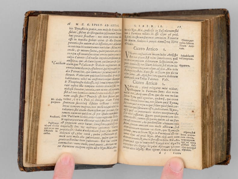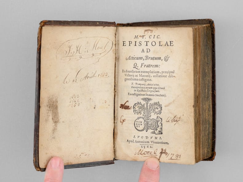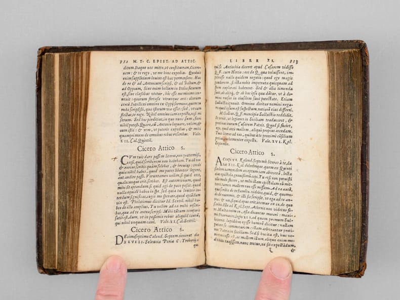 Ex diversorum exemplarium, praecipuè Victorij ac Manutij, collatione diligentissima castigatae. T. Pomponij Attici vita. Interpretatio eorum quae Graecè in Epistolis scriptasunt. Ex castigatione Ioannis Boulierij, 1 vol. in-12 reliure de l'époque plein veau brun, dos à 3 nerfs, filets et écoinçons estampés à froid en plats, Apud Antonium Vincentium [ Chez Antoine Vincent ], Excudebat Symphorianus Barbier [ Imprimé par Symphorien Barbier ], Lugduni [ A Lyon ], 1562, 656 pp. et 1 f. n. ch.