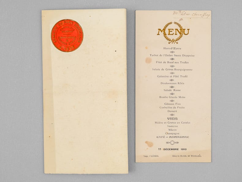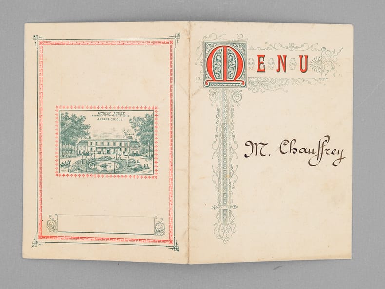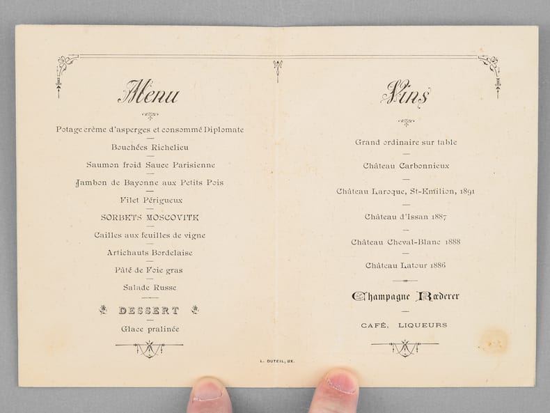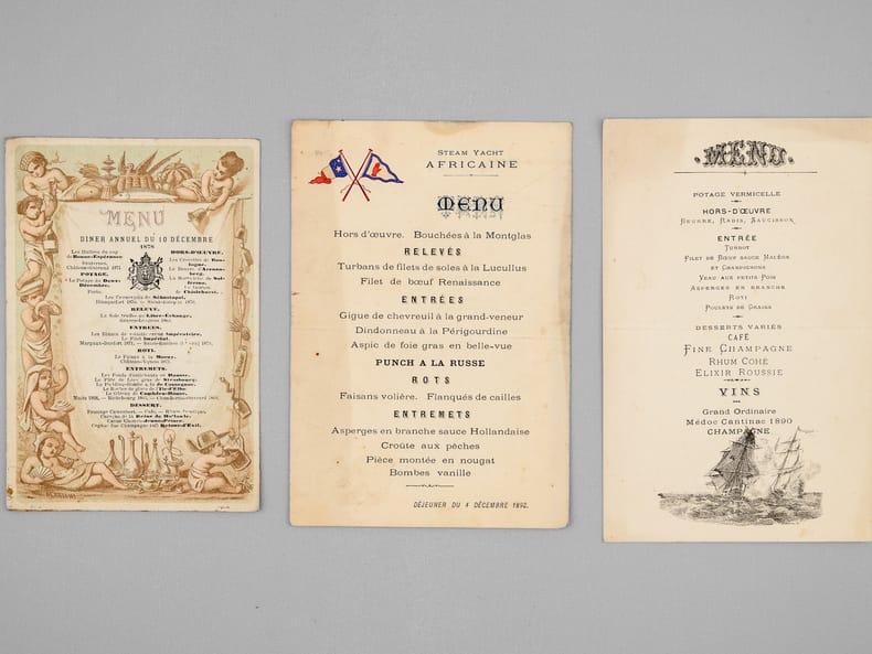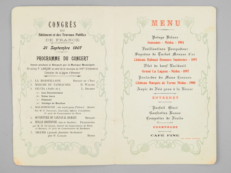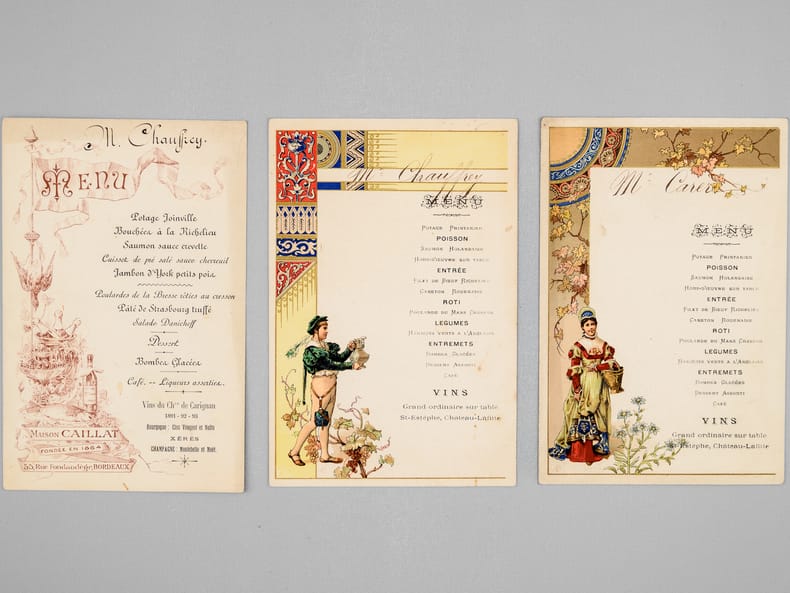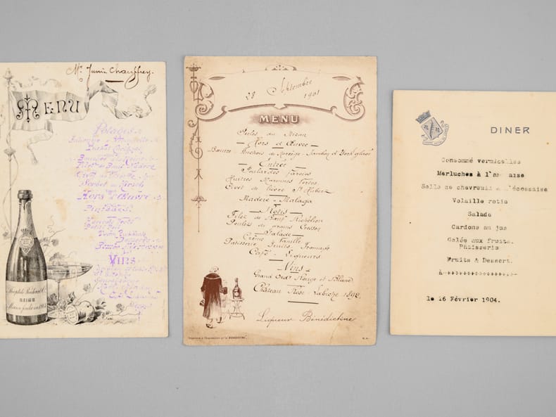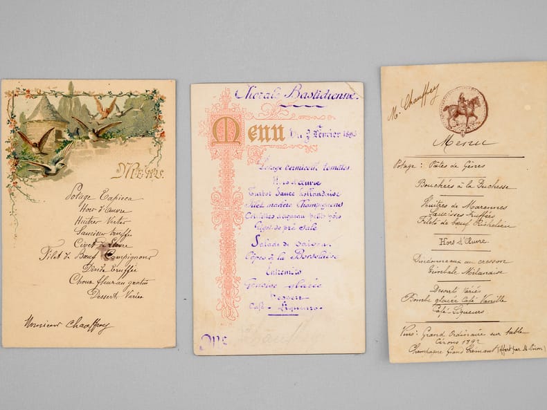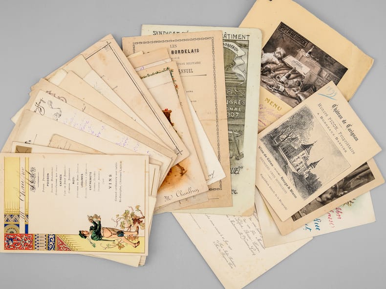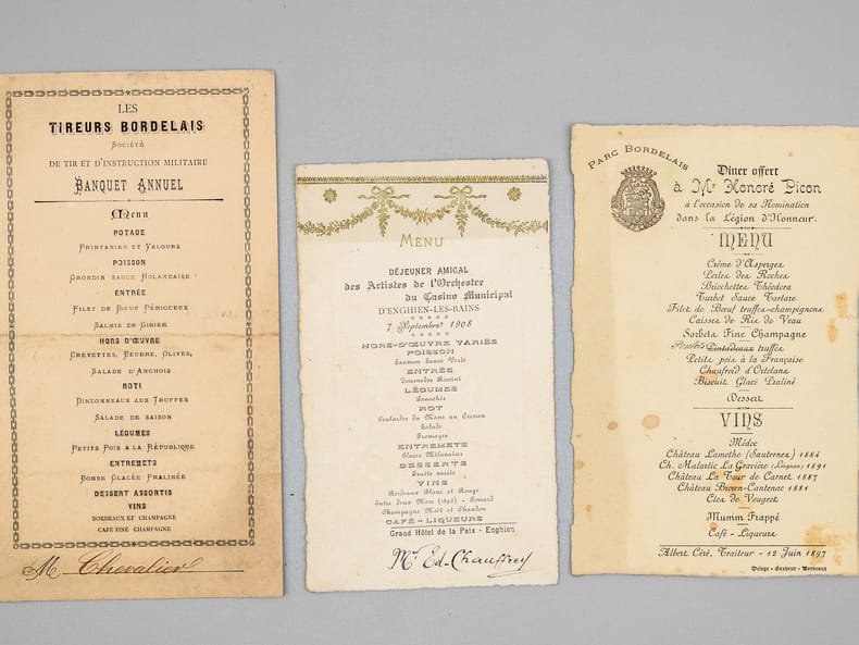 30 menus anciens, imprimés ou manuscrits, dont nombreux menus à Bordeaux et région bordelaise dont : Dîners offerts par ou en l'honneur d'Honoré Picon, Propriétaire à Bordeaux-Bastide, Château de Carignan (dont menu au "Parc Bordelais", Albert Céré traiteur, 12 juin 1897) ; Menu du dîner offert pour la Chorale bastidienne, Banquet offert au Conseil municipal de Carignan, Menu des "Tireurs bordelais Société de Tir et d'Instruction Militaire" ; Menu du Congrès du Bâtiment et des Travaux Publics de France, Bordeaux, 21 septembre 1907 ; Menu Dîner Annuel du 10 décembre 1878 ; Déjeuner Amical des Artistes de l'Orchestre au Casino Municipal d'Enghien-les-Bains 7 Septembre 1908 - Steam Yacht Africaine Déjeuner du 4 décembre 1892 - etc...