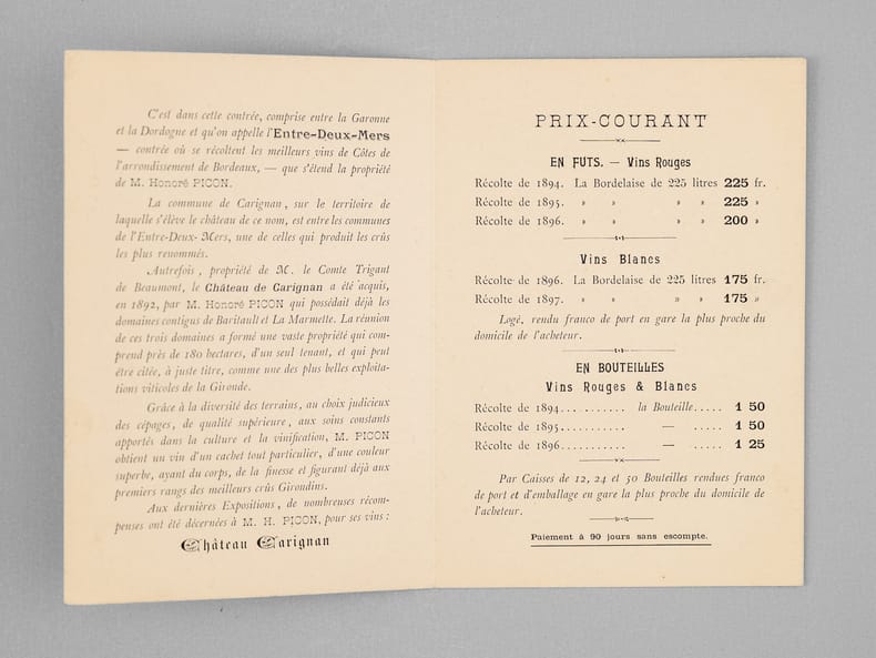 On joint quelques autres documents (dont tarif des vins du "Château de Carignan". Prix du lot, non séparable.