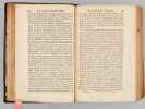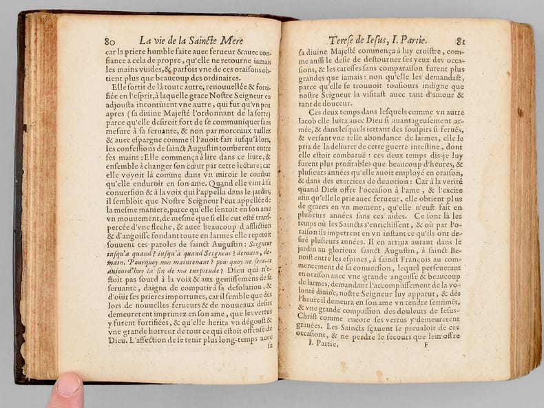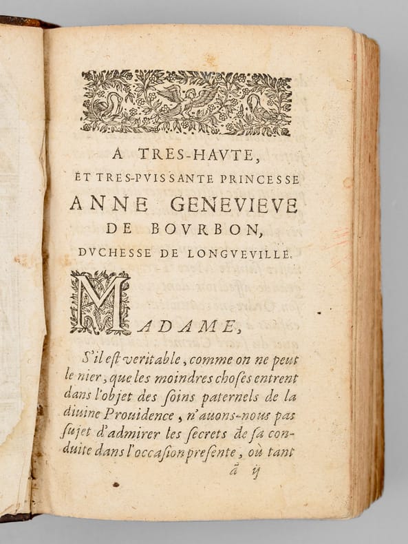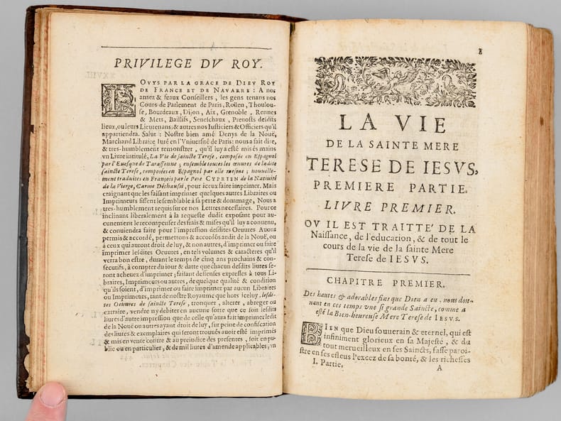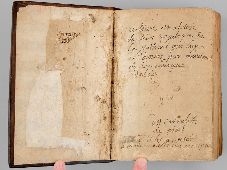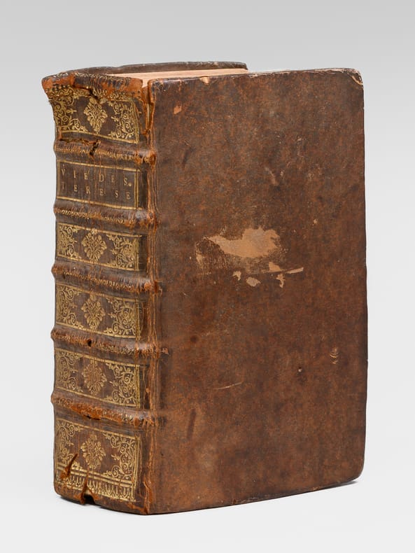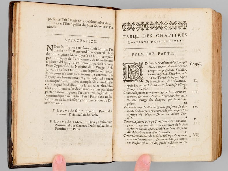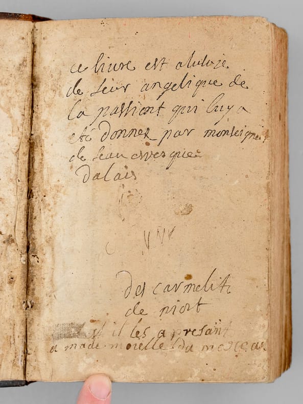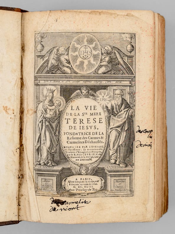 Un ex-libris manuscrit ancien en garde précise : "Ce livre est à l'usage de Soeur Angélique de la Passiont qui luy a été donnez par Monseigneur de Seau evesque d'Alais", "des Carmélites de Niort et il les a presant a mademoiselle [ du Marceau ?]" (sic). On sait que les premières carmélites de Niort, venant principalement de Paris, arrivèrent en 1648 et s’installèrent dans l’ancien hôtel de Barbezières situé en limite de la ville. L'ouvrage est dédié à Anne-Geneviève de Bourbon, duchesse de Longueville, et Victor Cousin précise dans son ouvrage consacré à "La jeunesse de Madame de Longueville" que parmi les "religieuses du plus haut rang et du plus aimable caractère qui étaient au couvent de la rue Saint-Jacques dans la jeunesse de Mme de Longueville" se trouvait "Mademoiselle de Thou, soeur Angélique de la Passion". Mais l'on sait aussi qu'érigé seulement en 1694, le diocèse d'Alais (Alès) eut comme premier évêque Mgr François Chevalier de Saulx, ce qui rend incertaine l'identification de l'auteur de l'ex-libris et de Mlle de Thou. Etat satisfaisant (accrocs avec manques en dos, sans le portait de Sainte Thérèse, feuillet de titre très faible avec mq. en marge, qq. mouill.) pour cet exemplaire d'intéressante provenance, à étudier.