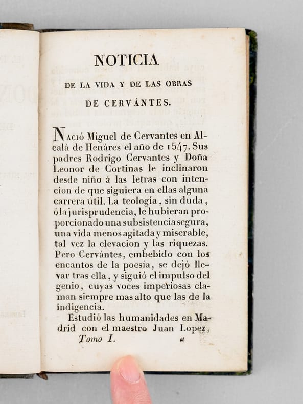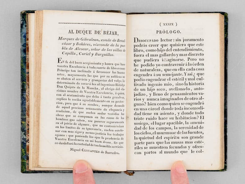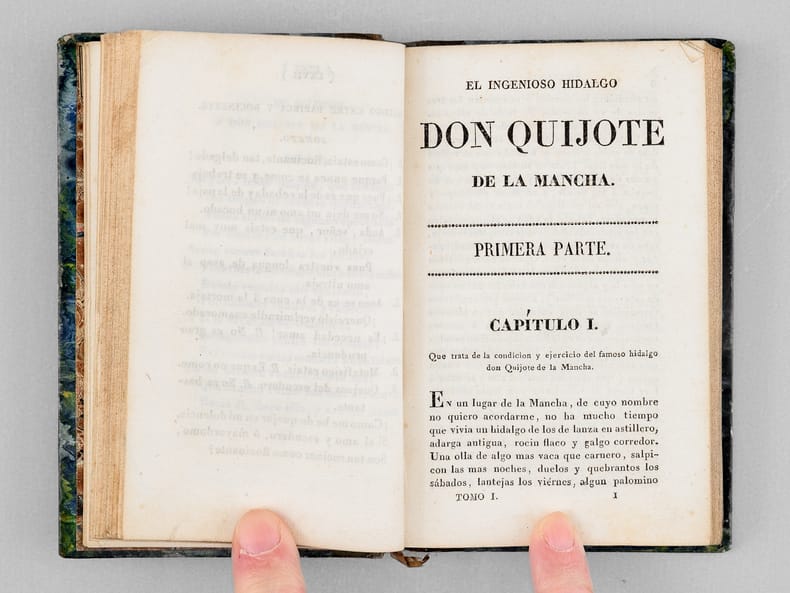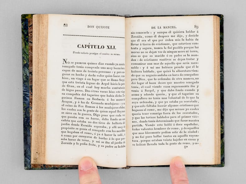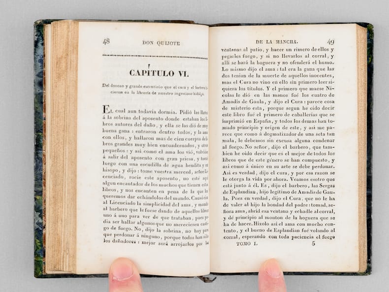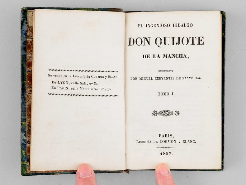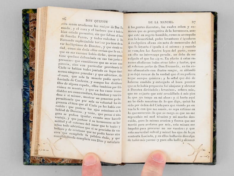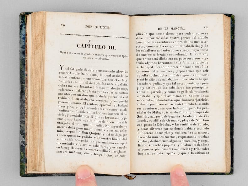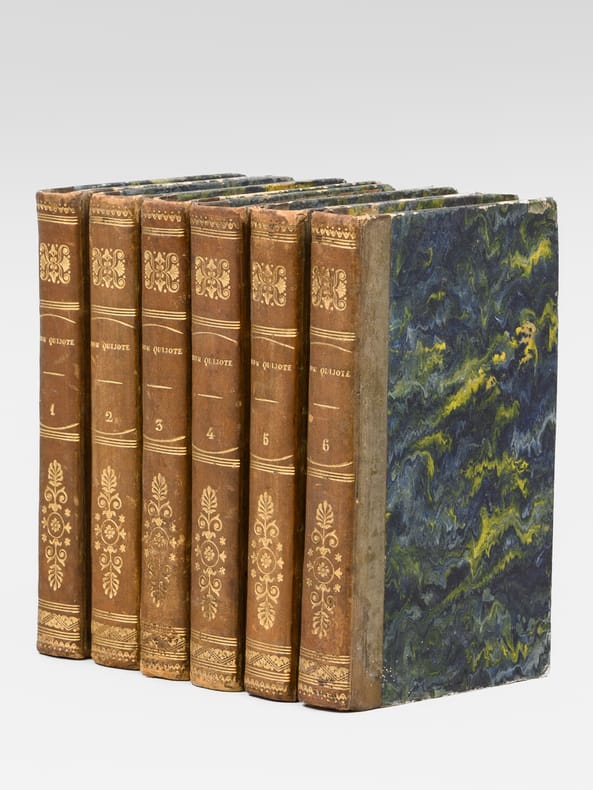 Etat satisfaisant (petit travail de vers n'affectant pas le texte en coins des 25 premiers feuillets du tome 3, petit poinçonnage en début du tome 6, reliures un peu frottées, une coupe frottée) pour cette petite édition peu commune du Don Quichotte.