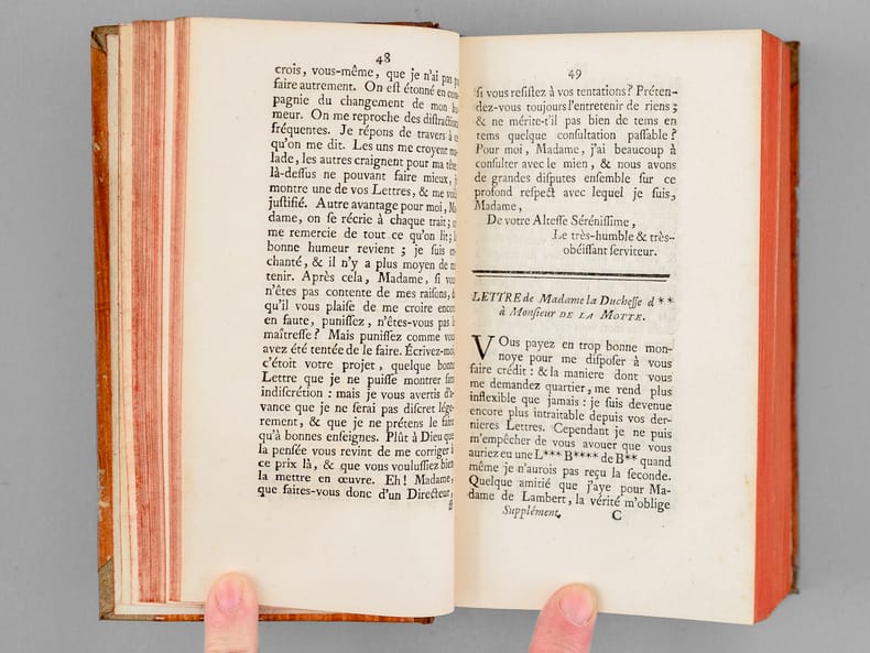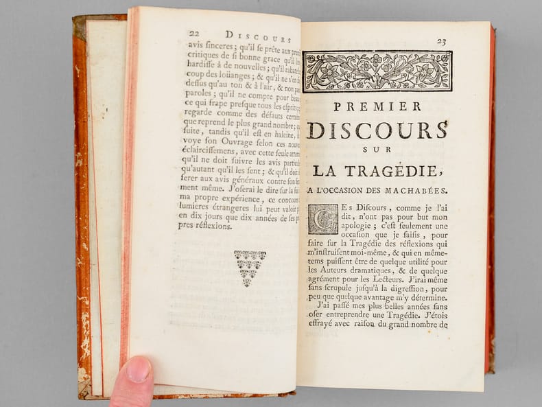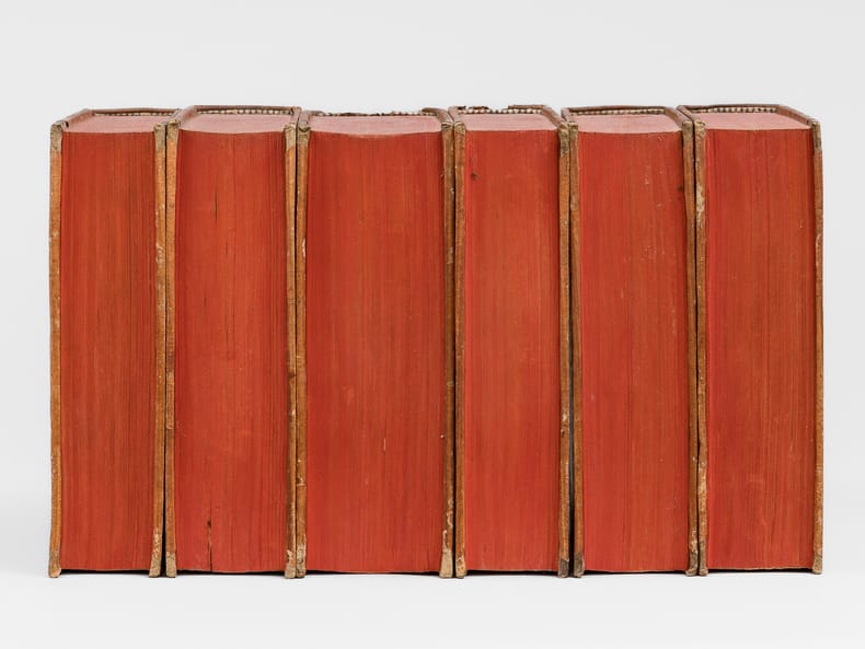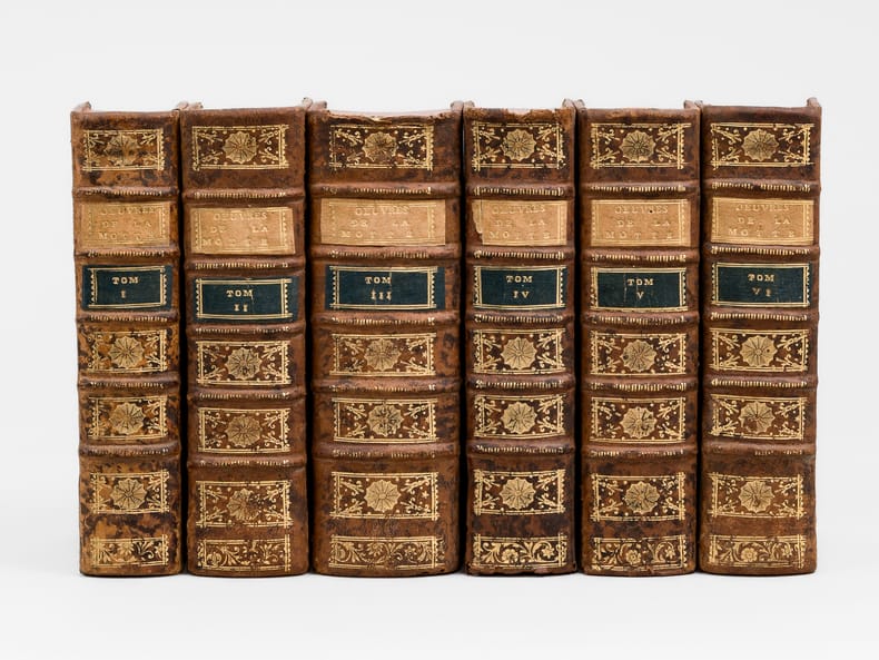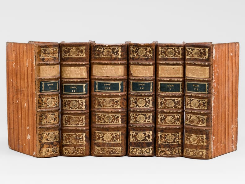 6 vol. in-12 reliure de l'époque pleine basane marbrée, plats recouverts de papier dominoté fin XVIIIe, dos orné (fleurons à la toile d'araignée), Chez Prault, Paris, 1754, 4 ff., LX-622 pp. ; 5 ff., 351 pp., 2 ff., 440 pp. ; 2 ff., 519 pp., 2 ff., 510 pp. ; 2 ff., 399 pp. ; 2 ff. 322 pp. ; 2 ff., 411 pp., 2 ff. (tables), 1 f., IV-493 pp. ; XXIV-262 pp., 2 ff., 473 pp.
