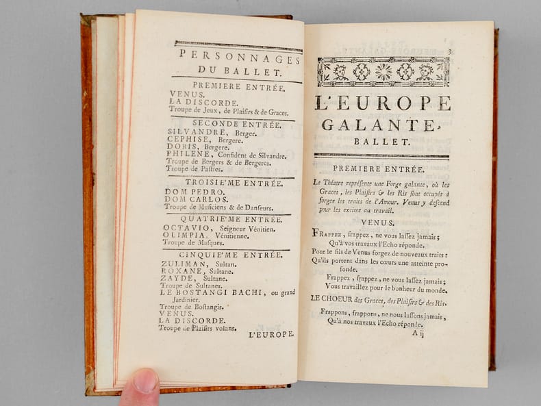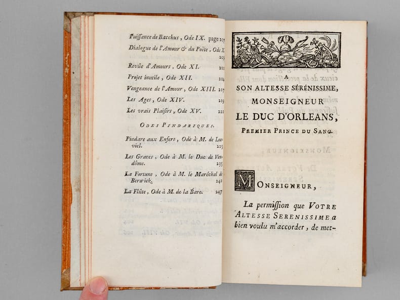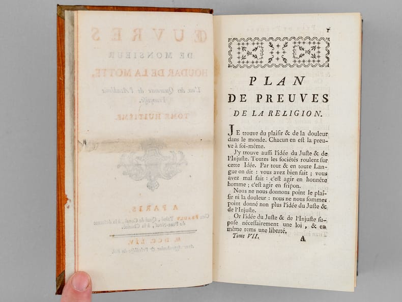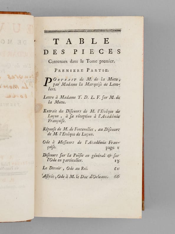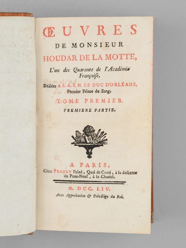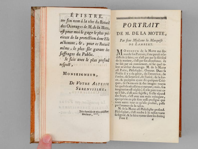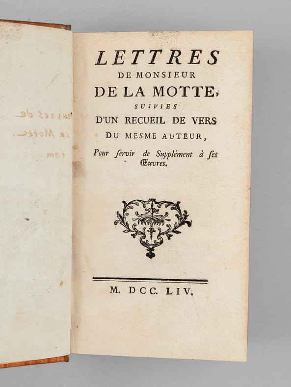 Antoine Houdar de La Motte (1672-1731) fut avec Fontenelle l'un des piliers du salon de la Marquise de Lambert, où il discuta notamment des mérites comparées de la prose et de la versification en poésie, ou de la validité des conventions du théâtre classique. Le dernier tome est constitué par les "Lettres de Monsieur de La Motte, suivies d'un Recueil de vers du mesme auteur, pour servir de Supplément à ses Oeuvres". Bon ensemble (petits manques en coiffes, plats couverts de papier dominoté, bon état par ailleurs). Brunet, III, 801