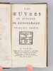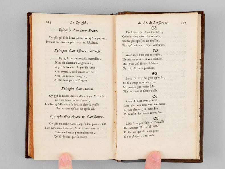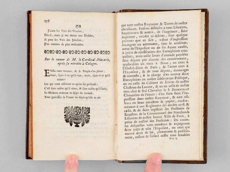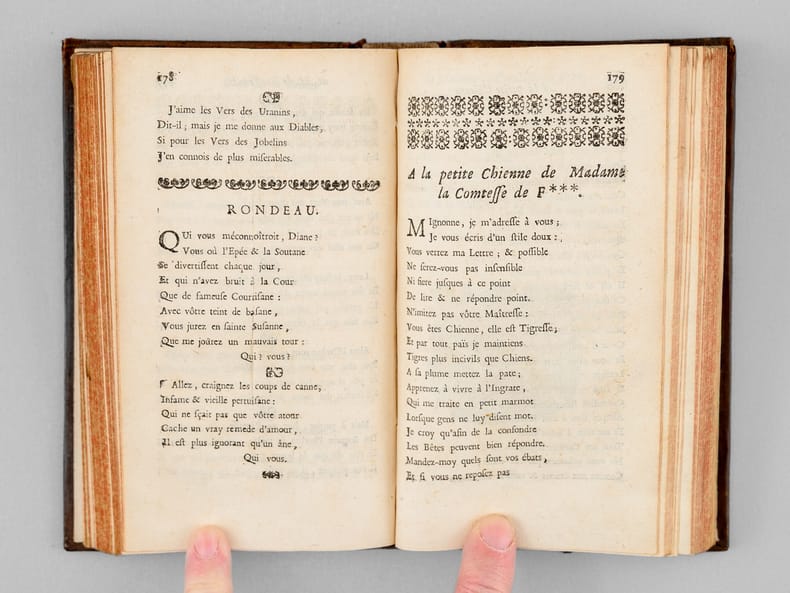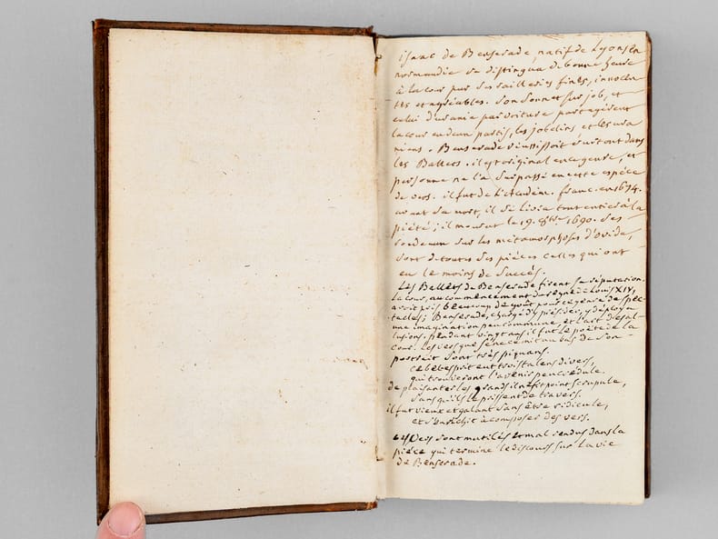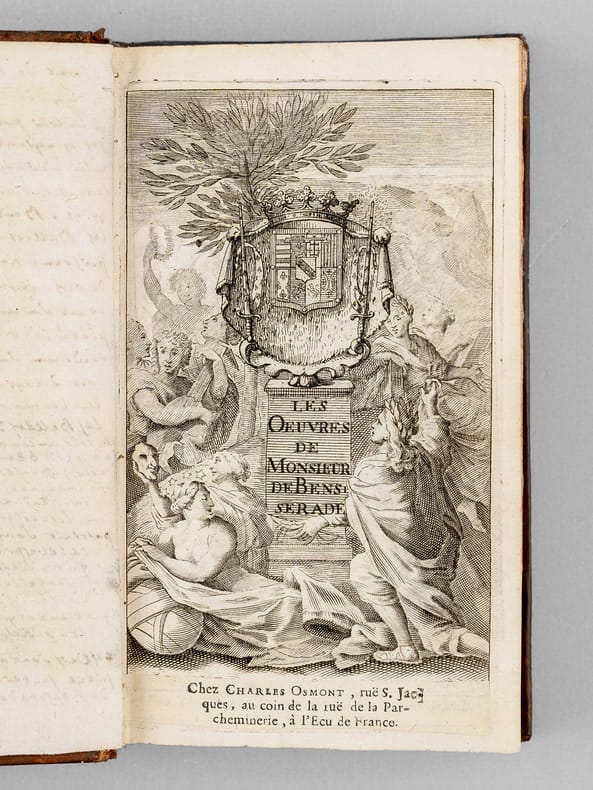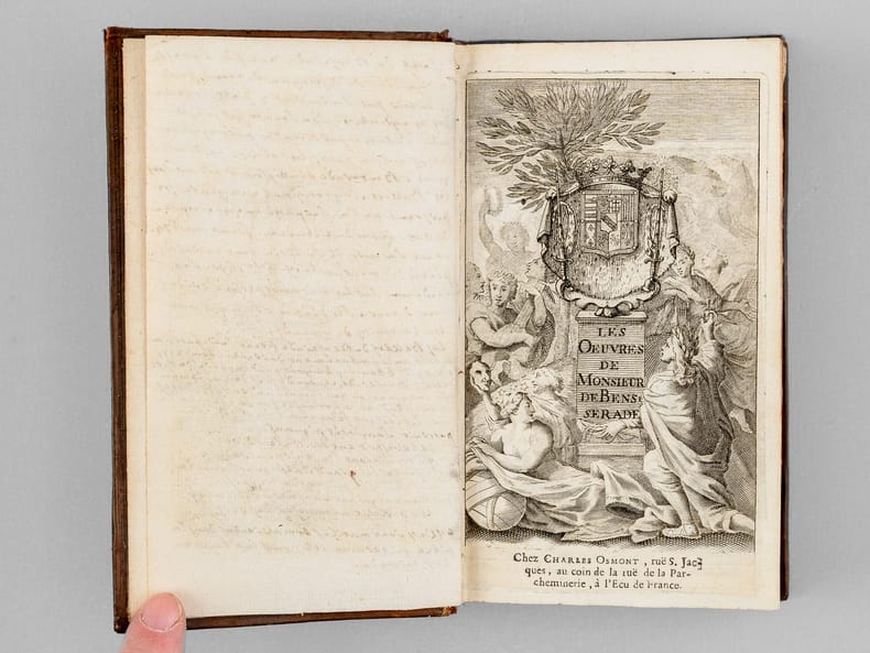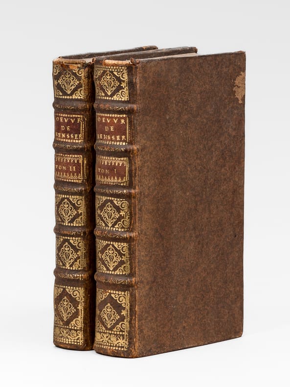 Curieux exemplaire de l'édition d'Osmont, parue, 2 ans après l'originale de 1697. Deux feuillets y ont été insérés entre les 2 feuillets du privilège, en fin du premier tome ; ces 2 ff. (pp. 213-214 et 177-178) viennent en doublon des 2 ff. originaux, partiellement fendus. Sur le second feuillet, le dernier texte de la page 178 (Rondeau "Qui vous méconnoitroit, Diane") est remplacé par le texte "Sur le retour de M. le Cardinal Mazarin, après sa retraite à Cologne" (la première version est sans doute un carton). Une longue annotation manuscrite en garde rappelle la vie d'Isaac de Benserade : "Isaac de Benserade, natif de Lyons en Normandie, se distingua de bonne heure à la cour par ses saillies fines, innocentes et agréables. Son sonnet sur Job, et celui d’Uranie parurent diviser la cour en deux partis, les Jobelins et les Uraniens. Benserade réussissoit surtout dans les Ballets. Il y fut original en ce genre, et personne ne l’a surpassé en cette espèce de vers. Il fut de l’Académie française en 1674. Au haut de sa mort, il se livra tout entier à la piété; il mourut le 19 octobre 1690. Ses rondeaux sur les métamorphoses d’Ovide, sont de toutes ses pièces celles qui ont eu le moins de succès. Les Ballets de Benserade firent sa réputation. La cour, au commencement du règne de Louis XIV, avoit pris beaucoup de goût pour ce genre de spectacles ; Benserade, chargé d’y présider, y déploya une imagination peu commune et l’art des allusions. Pendant vingt ans il fut le poète de la cour. Le vers que l’on écrit au bas de son portrait sont très piquans [... ]." Bon état (petits mq. en coiffes)