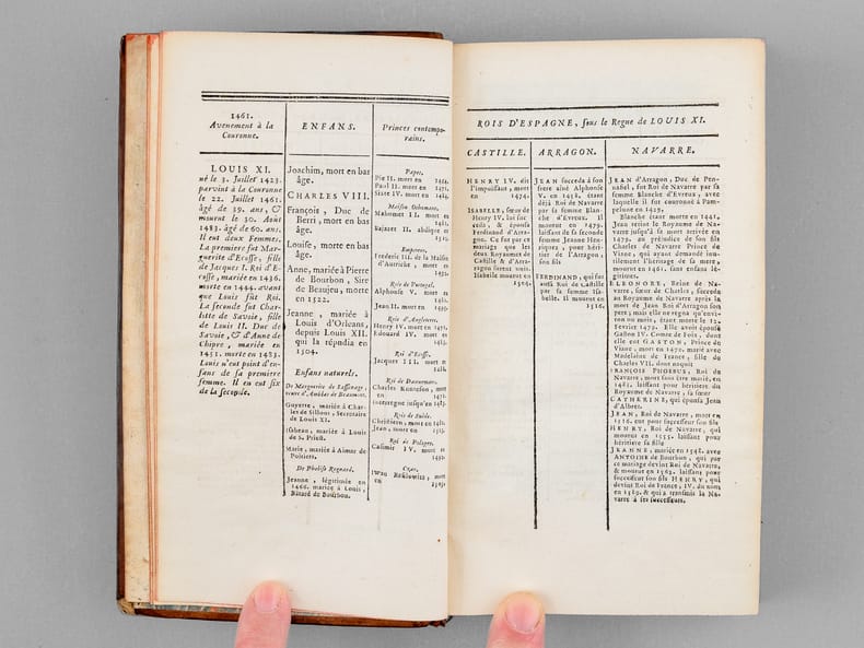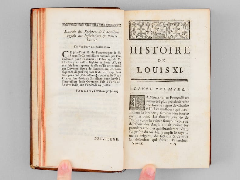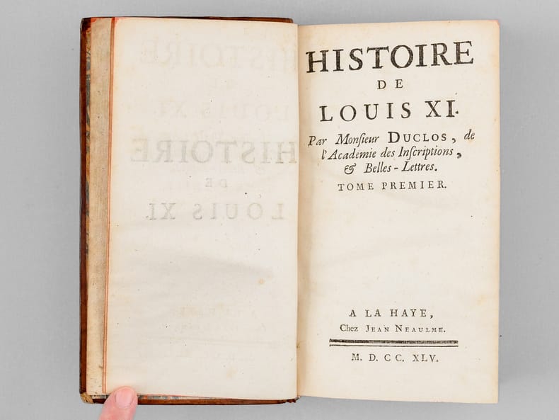 Par Monsieur Duclos, de l'Académie des Inscriptions & Belles-Lettres , 2 vol. in-12 reliure de l'époque plein veau marbré, Chez Jean Neaulme, A La Haye, 1745, 4 ff., XXIII, 440 pp. ; 2 ff., 518 pp. et 29 ff. n. ch. (tables)