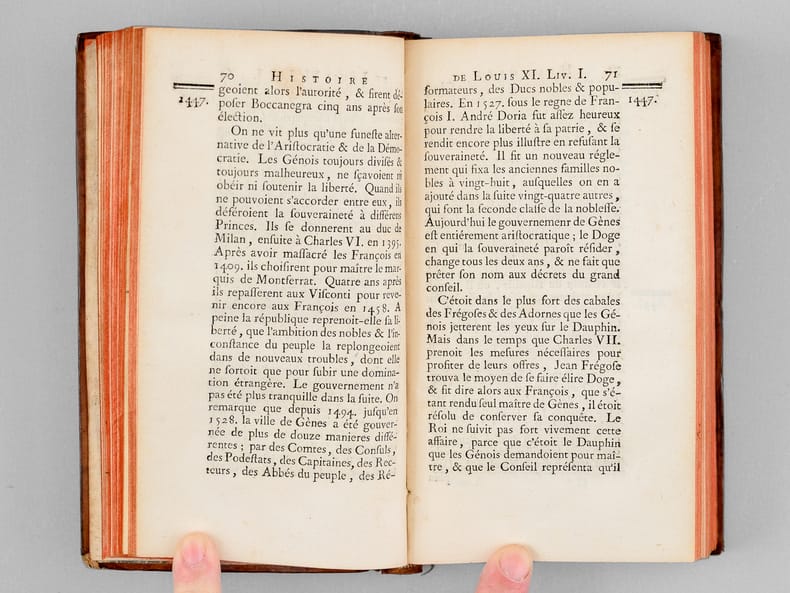 L'exemplaire est complet de la biographie de Louis XI, mais sans le troisième tome contenant le "Recueil de Pièces pour servir de suite à l'Histoire de Louis XI". Bon état (petites usures en coiffes)