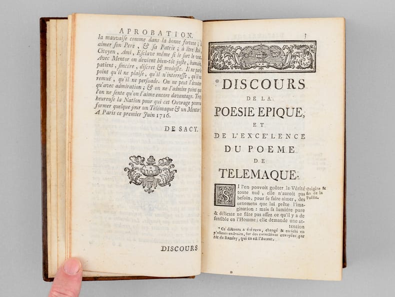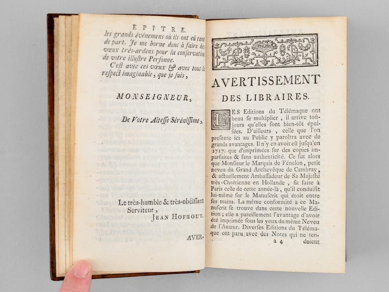 The very rare Bruxelles-edition, published same year as the first edition (Paris, Barbin). Fénelon's main work, written when he was a tutor to the Duke of Burgundy in order to hold up Ulysses as an example for the young prince. Fénelon was a leader of the Quetism heresy, and in 1699, the year Télemaque appeared, Pope Innocent XII condemned his writings. The true first edition of Fénélon's Télemaque appeared in one volume in 1699 under the title ""Suite du quatrième livre de l'Odyssée d'Homère, ou les Aventures de Télémaque, fils d'Ulysse"", and containing only half of what we consider Télémaque today. According to Brunet, the first edition was suppressed, and Moetjens printed a pirate-edition (called the second edition) in Haag with the same year and date (June), and a bit later the same year, the second part appeared. Several editions appeared the same year, and Brunet mentions one without printer or Place (but Paris), and the Liége- and Bruxelles-editions. ""Dans les différentes éditions que nous venons de décrire dans lesquelles il le soit sont celles de LIÉGE, 1699, et de BRUXELLES, FR. FOPPENS, même date, l'une et l'autre impr. en France, en 2 vol. in-12, et en dix livres."" (Brunet II:1212). Foppens also printed an edition in Bruxelles 1700, but that is divided into 16 books. All early editions of this work are scarce, and the first edition is almost impossible to get a hold of. This main work of French literature has been printed numerous times after the author's death (1715), and editions printed before his death, are a great rarity. The later editions were corrected and divided into numerous books, not intended in the original manuscript.""Une autre circonstance allait aggrever la situation de l'archevêque de Cambray. Peu de temps après sa condemnation, parut le livre qui l'a rendu le plus populaire et qui, après la ""Bible"" et l'""Imitation de Jésus-Christ"", est un de ceux qui ont eu plus d'éditions: ""Les Aventures de Télémaque"". (N.B.G. 17:328). The controversial but highly popular work was, among other things, accused of satirically portraying Louis XIV, and thereby publicly humiliating him, -this was probably not the intention, but there is no doubt that the work was critical towards the reigning regime, and put forth many ideas not previously heard of. In true utopian political manner, Fénélon warns against overgrowth of the metropolis and preaches groundbreaking doctrines like free trade, international arbitration etc. He actually foresees the French Revolution as a result of the flourishing despotism so visible in France at the time. Lamartine (in his ""Life of Fénélon"") describes the saintly poet as the first Radical and the first communist of his century, though not to his own knowledge, and he directly traces the Utopias which produced the revolutions of 1793 and 1848 to his groundbreaking work, ""The Adventures of Telemachus"". Especially the part ""Voyage en Salente"" is considered very important for the study of utopian literature, but the entire work is characterized by the attempt to represent people as they might have behaved and might still be, were they governed by sages and saints and according to the laws of God. The work represents a religious ideal where God is always higher than man" it is greatly political, greatly influenced by the appreciation of ancient Greek life, and is designed to evoke the feeling of honour, responsibility and religion in the young prince. See Brunet II: 1210-1212. Graesse 2:563-64 (Paris- and La Haye-editions).