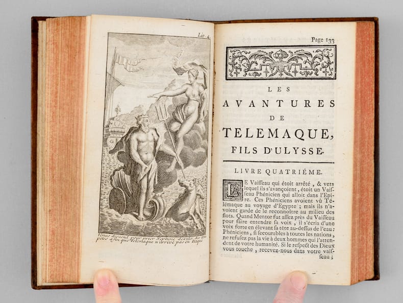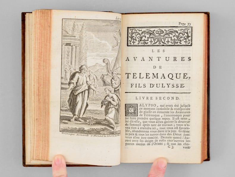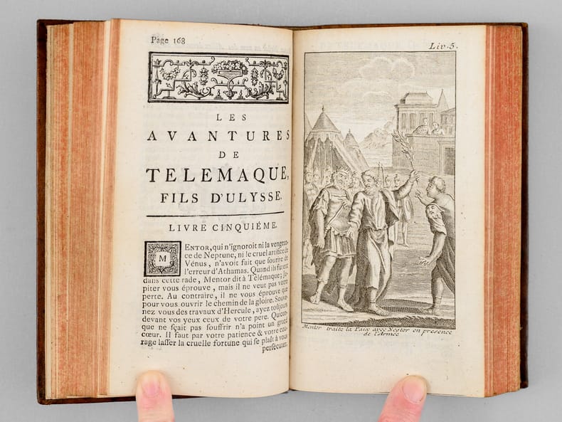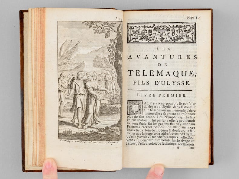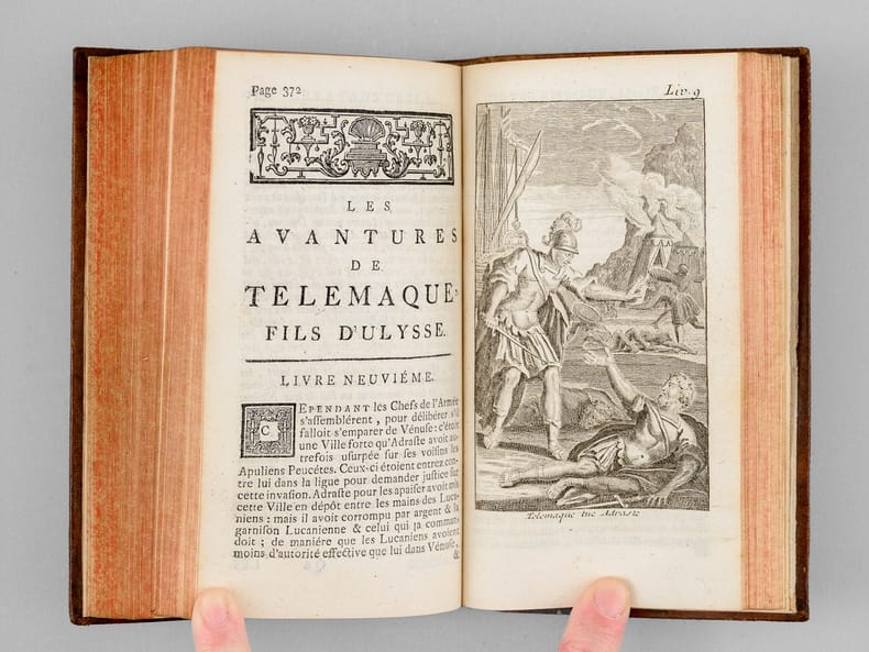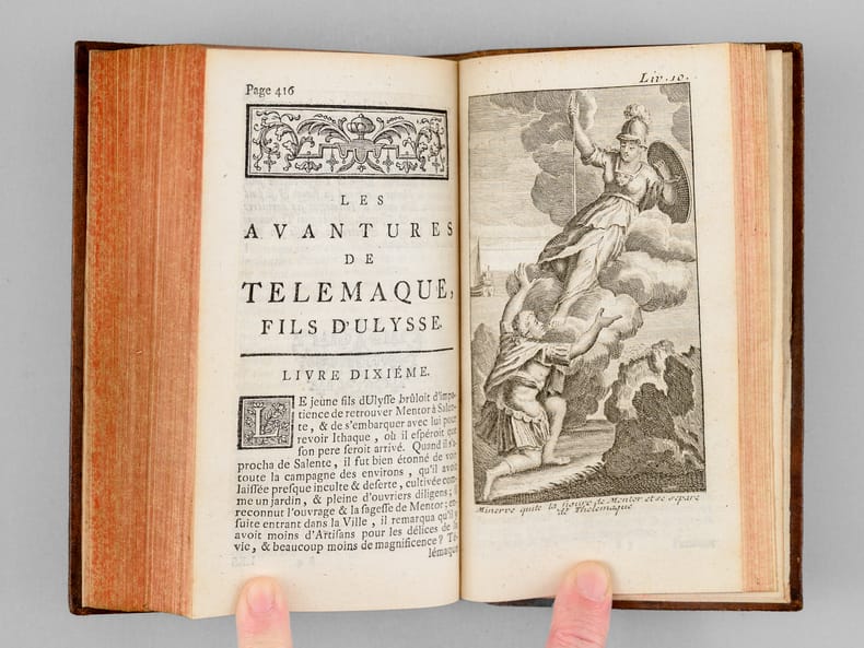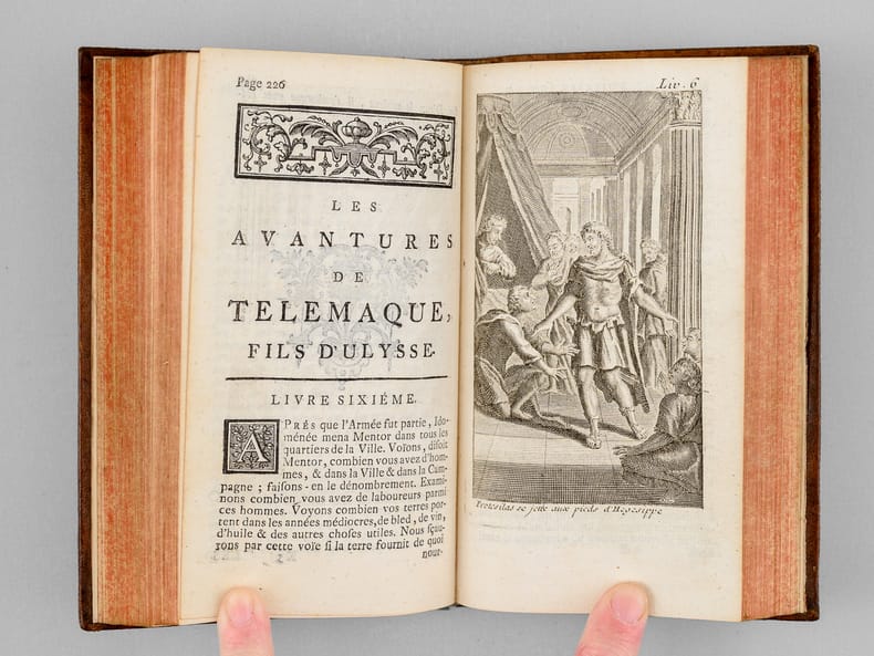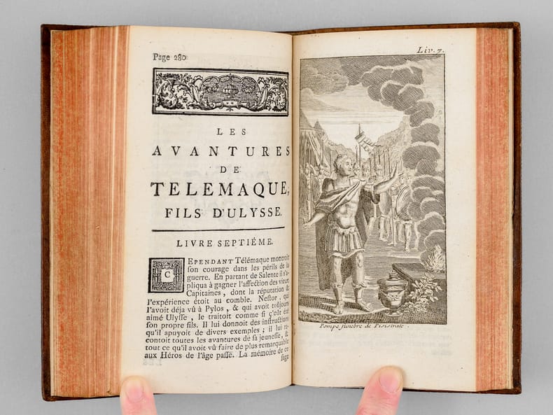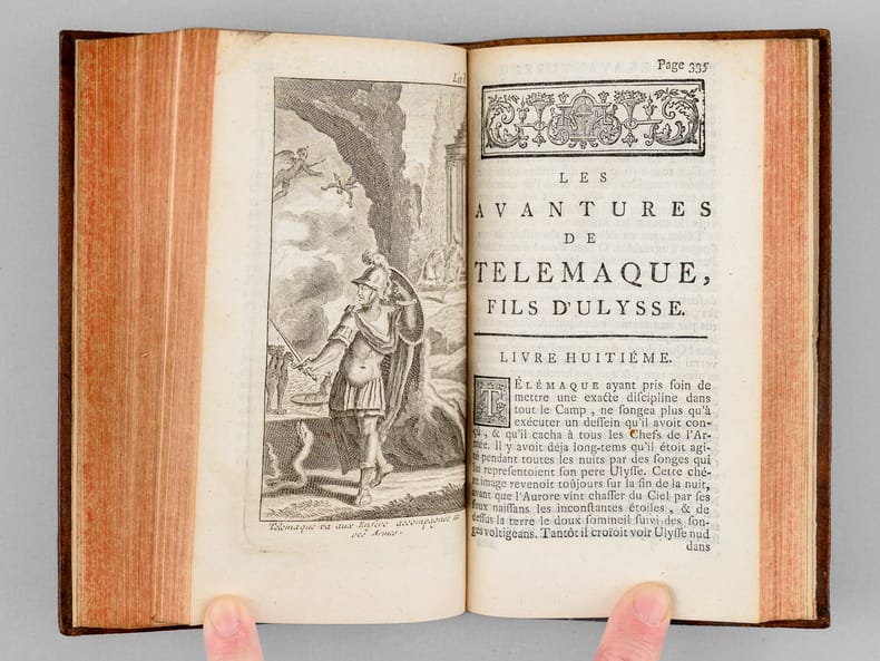 Jolie édition illustrée d'un frontispice et de 10 planches hors texte. Une longue note manuscrite ancienne en garde commente l'ouvrage et l'édition : "Cet ouvrage immortel est de François de Salignac de la Motte-Fénelon, l'un des plus beaux génies que la France ait produit, né en Quercy le 6 août 1651. D’une famille noble et ancienne, précepteur des enfants de France en 1689. de l’acad. franc. en 1693. Archevêqur de Cambrai en 1695. relégué dans son dio cèse à cause de son livre des maximes des saints, en 1697. et mort à Cambrai le 7 janv. 1715. Cet ingénieux prélat déploie dans les aventures de Télémaque toutes les richesses de la langue, et toutes les vertus qui le rendoient si recommandable. Quoique l’on s’élève dans l’avertissement des libraires contre les éditions qui ont paru avec des notes, cela n’empêche pas qu’elles ne soient plus chères que celle-ci, dont le prix est de trois à quatre livres. Voici celui des autres d’après le diction. d'osmont [ etc... ]". Etat très satisfaisant (plats frottés, petite usure en coiffe en queue, bon exemplaire par ailleurs)