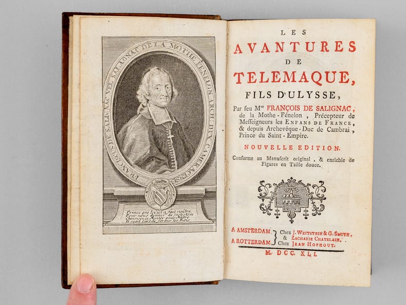Par feu Me. François de Salignac de la Mothe-Fénelon, Nouvelle Édition conforme au Manuscrit original & enrichie de Figures en Taille douce, 1 vol. in-12 reliure de l'époque plein veau brun, dos à 5 nerfs orné, Chez J. Wetstein & G. Smith & Zacharie Chatelain à Amsterdam, Chez Jean Hofhout à Rotterdam, 1740, 6 ff., XL-476 pp. avec un frontispice et 10 planches hors texte
