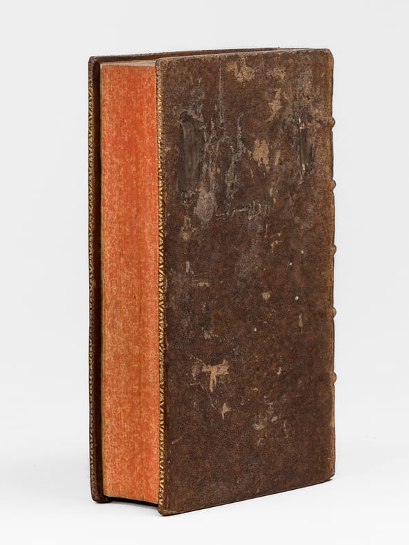 Bruxelles, Fr. Foppens, 1699. Small 8vo (12mo). Bound in a beautiful later full calf (ca. 1800) w. five raised bands on back. Gilt back and blindstamped ornamental borders on boards. All edges of boards gilt, and gilt borders on inside of boards. Hinges cracked and boards loosening, inner hinges crudely repaired. A bit of brownspotting, but internally a very nice copy.