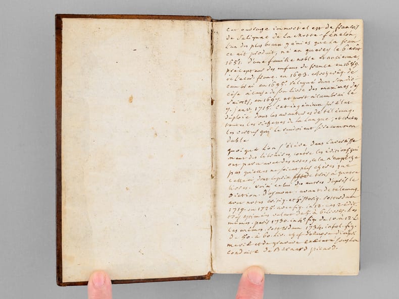 Tome 2 seul. Il s'agit probablement du tirage signalé par Tchemerzine mais non vu par lui (Tchemerzine, V, 203 b). L'ouvrage se termine sur les "avantures d'Aristonoüs". Mauvais état (rel. fort. frottée, essais de plume en garde, usure au faux-titre, travail de vers marginal sur qq. ff.) pour cet ouvrage d'intérêt bibliographique. Dans l'édition de 1811, Adry indique que la présente édition est la vraie édition conforme (celle en seize livres y étant dénoncée comme contrefaçon). Prix en l'état. Voir aussi : Marie-Christine Kok Escalle, « Des éditions hollandaises des Avantures de Télémaque », Documents pour l’histoire du français langue étrangère ou seconde