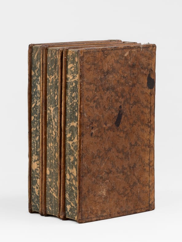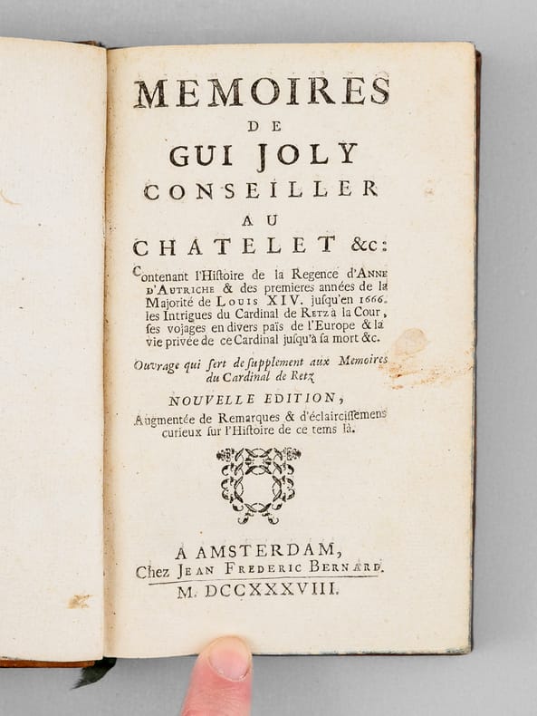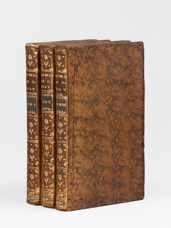 3 vol. in-12 reliure de l'époque plein veau marbré, dos lisse orné, coupes ornées, Chez Jean Frederic Bernard, Amsterdam, 1738, 1 f. (titre rapport des Mémoires de Gui Joly), 7 ff., 243 pp. ; 1 f., 300 pp. ; 5 ff., 167 pp. et 2 ff. n. ch. Rappel du titre complet : Mémoires de Gui Joly, conseiller au Châtelet &c. Contenant l'Histoire de la Regence d'Anne d'Autriche & des premieres années de la Majorité de Louis XIV jusqu'en 1666, les Intrigues du Cardinal de Retz à la Cour, ses voyages en divers païs de l'Europe& la vie privée de ce Cardinal jusqu'à sa mort &c Ouvrage qui sert de supplement aux Memoires du Cardinal de Retz. Nouvelle Édition augmentée de Remarques & d'éclaircissemens curieux sur l'Histoire de ce tems là [ Suivi de : ] Mémoires de Madame la Duchesse de Nemours : Contenant ce qui s'est passé de plus particulier en France pendant la guerre de Paris, jusqu'à la prison du Cardinal de Rets en 1652, avec les différens caractères des Personnes de la Cour