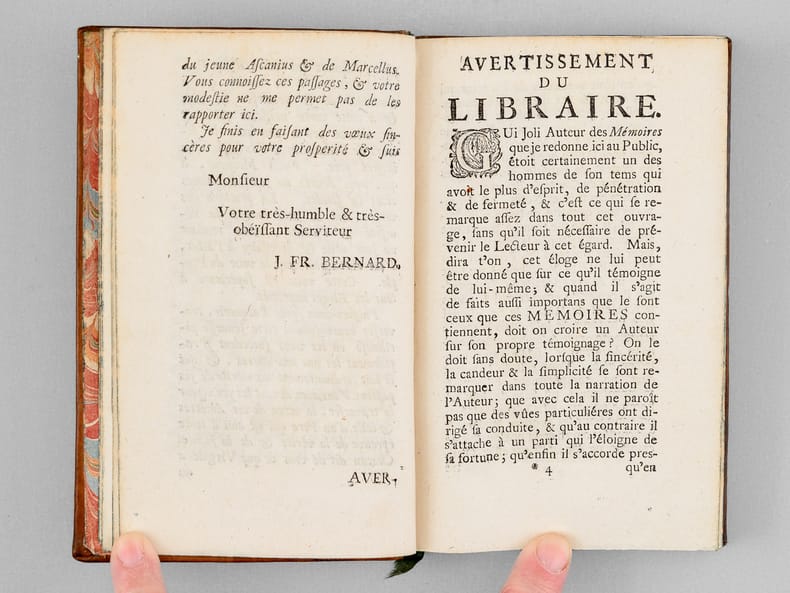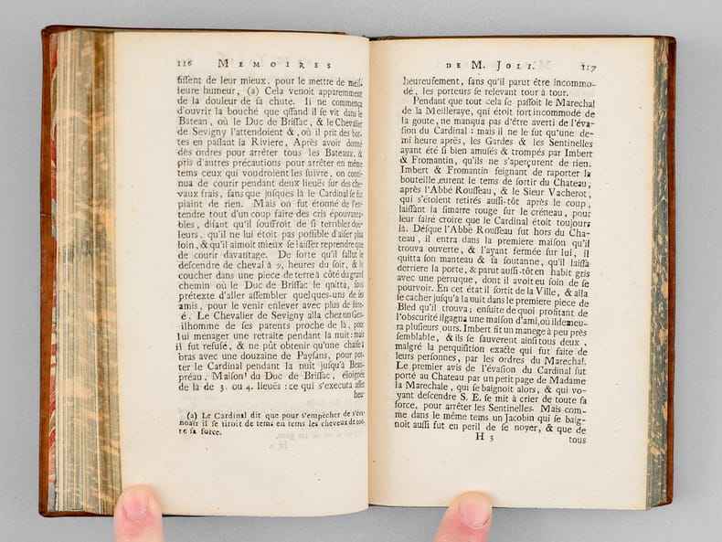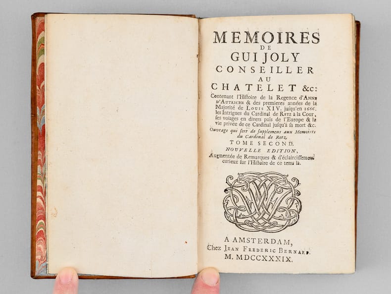 Comme souvent, les Mémoires de la Duchesse de Nemours, évoquant la Fronde, sont joints en un troisième volume aux Mémoires de Gui Joly. Bon ensemble (mq. à une coiffe, trace de grecquage à la page de titre général rapportée dans le 3e volume).